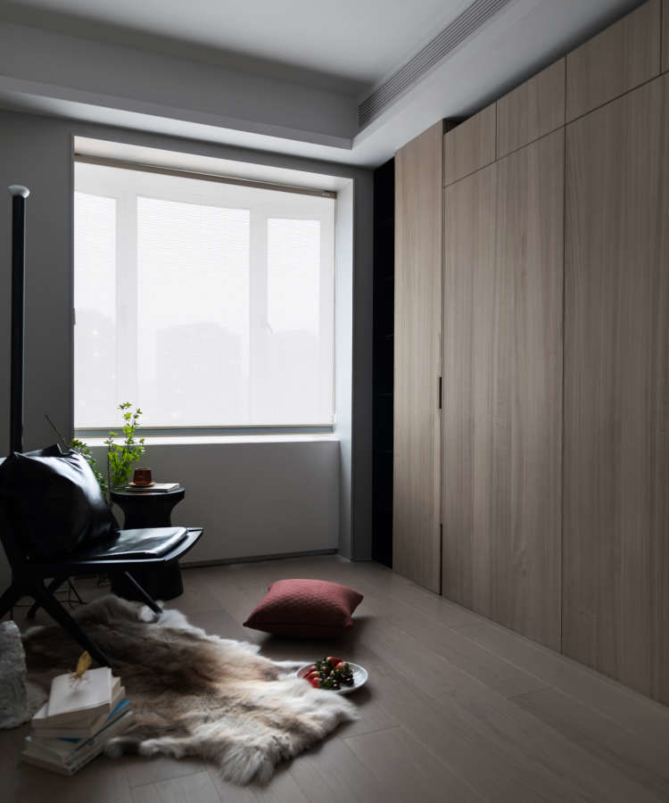 在进入两个主要卧室的空间之前会经过一个相对狭小用木作包覆的过道空间,过道的照明采用地脚灯和漫反射的灯带,通过材质、灯光和空间尺度的变化来提示从公共区域进入到了私密区,同时柔和的灯光和木作的温润感也使人的心情感到安静平和。