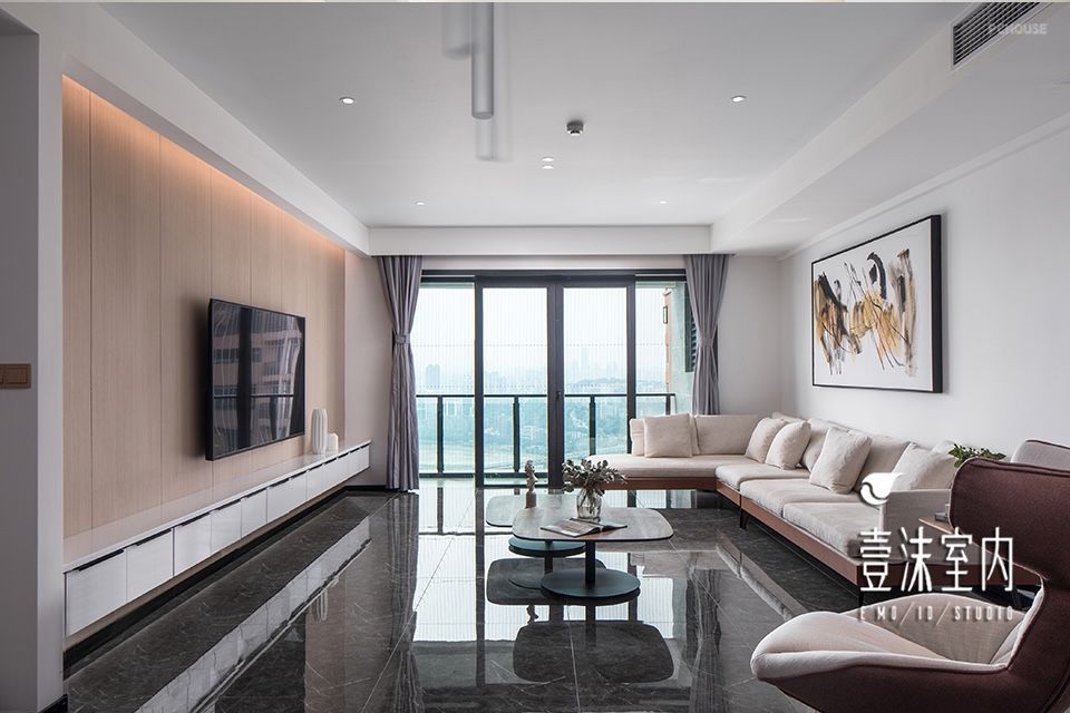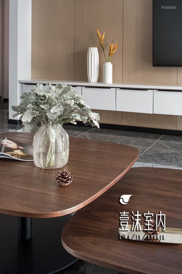 悬空的电视柜设计即节省空间又美观大方同时也方便业主做清洁。错落有致的茶几增加了空间的层次感