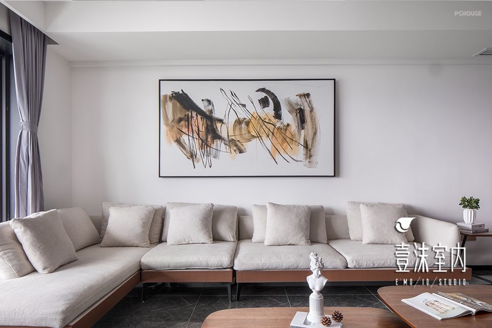 客厅采用L型的围合式沙发加强了家人之间的相互交流,线条简洁的设计呼应了硬装的空间布局。抽 象的装饰画打破了空间的沉闷感,跳跃的橘色丰富了空间的色彩,让空间更加具有张力
