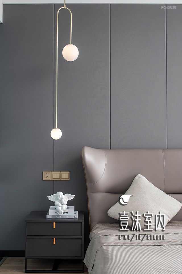 主卧的背景墙做软包设计以升空间的质感。左右对称的吊灯让空间显得庄重却不失温馨,棉麻