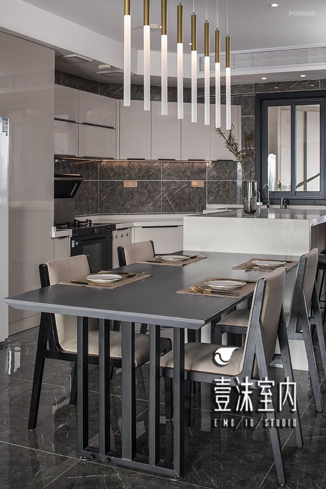 为了弱化走廊狭长的局促感将书房的门设计成两扇玻璃大滑门以增加走廊的采光。走廊尽头的餐桌和吧台高低错落的设计增加了空间的层次感。