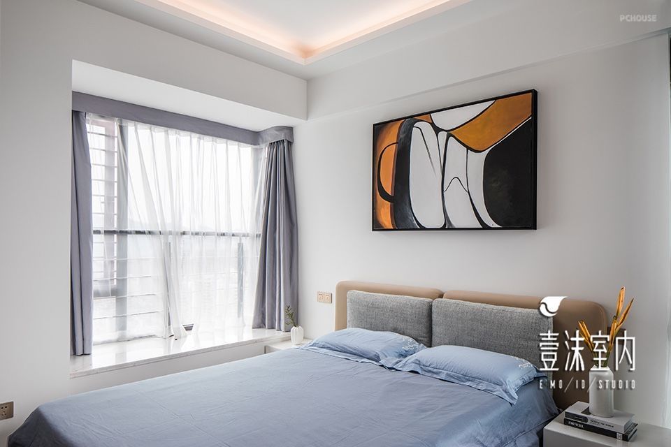 老人房的设计以实用性为主,浅色的床品搭配橘色的抽象装饰画让空间简单却不失温度,柔和的