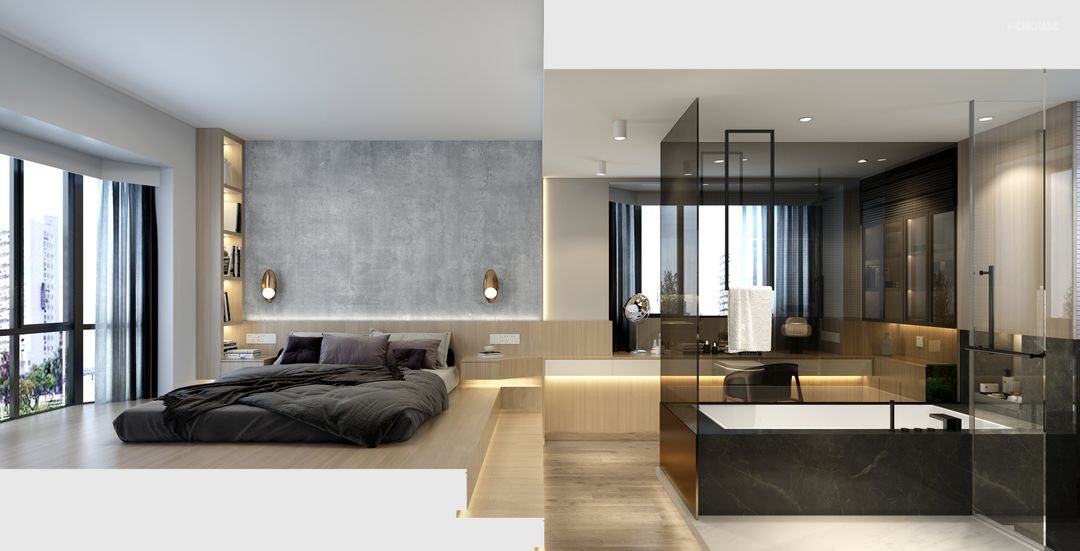 设计对空间进行打破重组,将空间规划为公共区域和私密区。公共区满足交流会客,就餐需求。私密区主要是卫生间,书房,卧室功能。卧室设计为台阶式榻榻米床,与飘窗做一个延伸。台阶式设计提供不同情境式的交流场景和视野,同时增加抽屉收纳。卫生间作为一个独立的盒子设计,打破传统的隔墙,改为黑色玻璃,强化区域界线的同时,也提供了视线交流的可能性。不同的空间呈现出不同生活情境,且能够视线无遮挡的交流沟通。