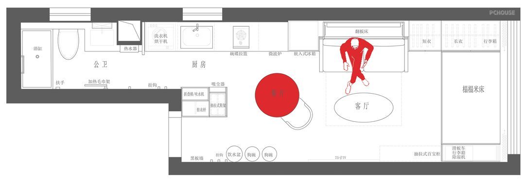 当拿到这个户型的时候,我们很诧异,深圳还有如此小面积的纯住宅,诧异这是一个人和两条狗(后来又加了一条)的家,更诧异的是,客户赵小姐的需求有60多条!详细到宠物狗的储粮桶规格……