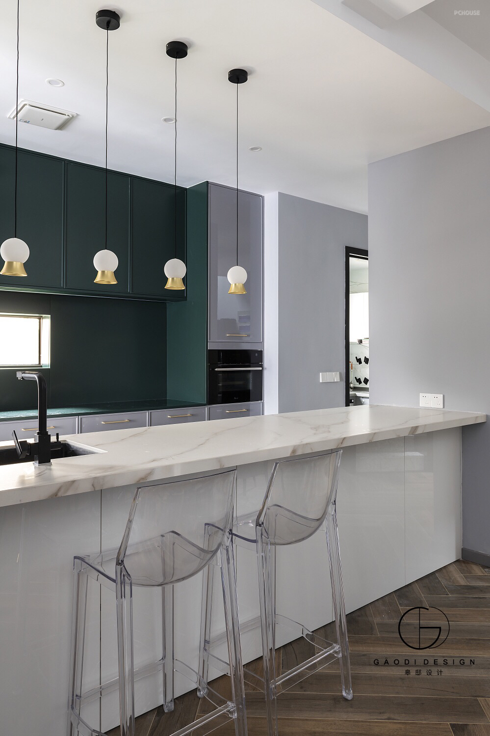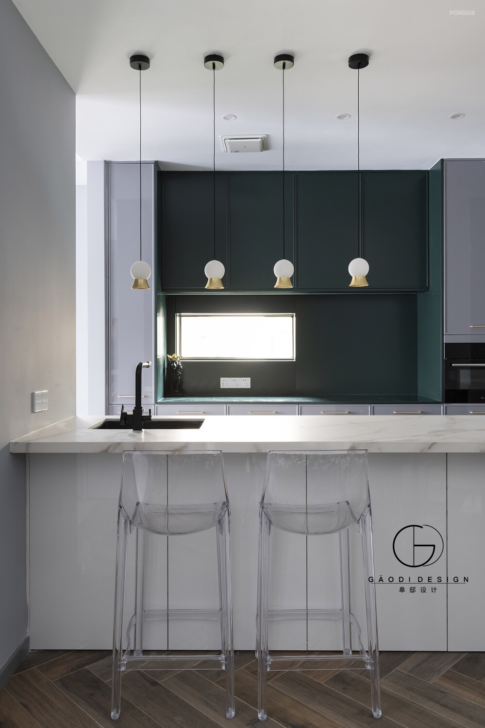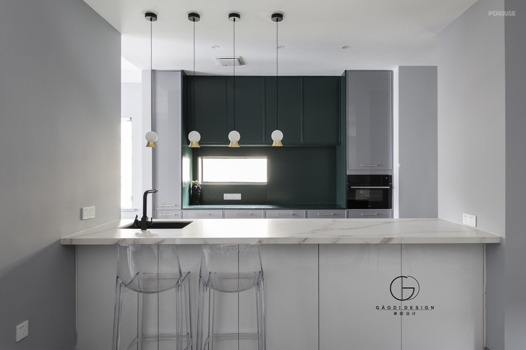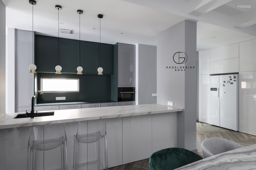 浅灰色显得很高级,但如果全部用浅灰色又会比较偏冷淡风,所以加入了墨绿色的元素,和谐不觉突兀 ,西厨旁边进去就是封闭式中厨了,中餐的爆炒神马的毫无压力