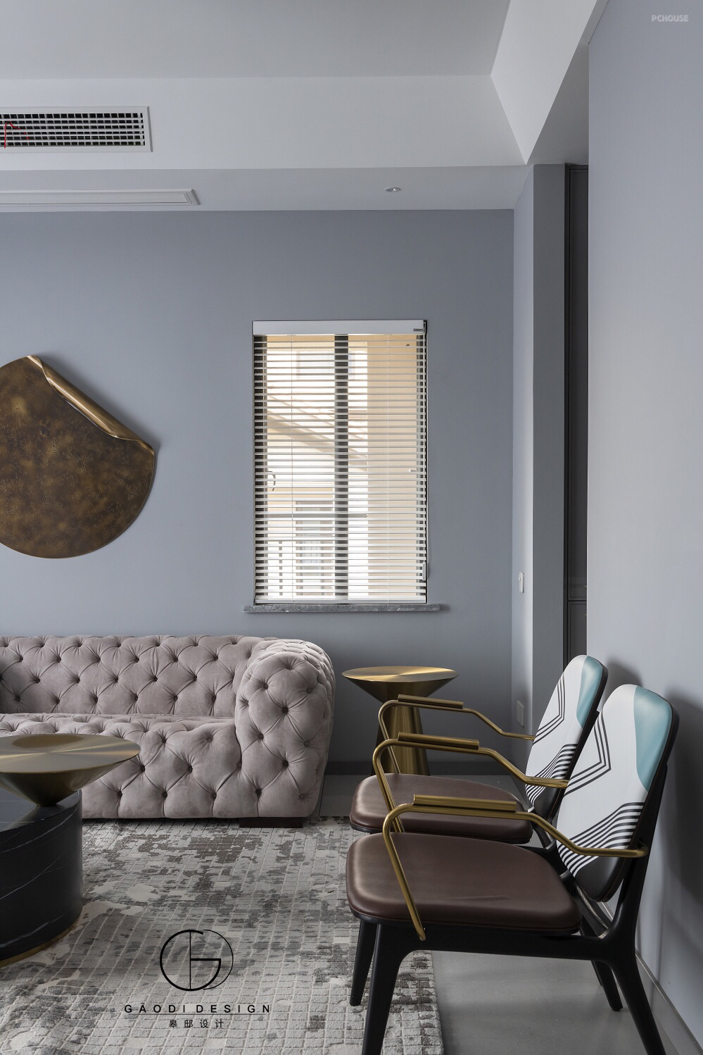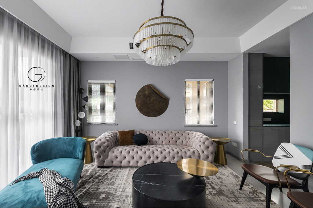 传统的妃位那种沙发不适合这里,太占地方,所以用这个长到可以躺的丝绒沙发代替,湖蓝色很亮眼,又有安静的感觉