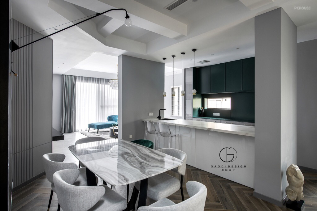 餐厅和客厅之间有两个承重墙不能打,岛台不能做在厨房门外的时候业主有些郁闷,设计师最有想出了缩小中厨,在两个承重墙之间做个超大岛台,然后将西厨和中厨彻底分开,这样看感觉很大气 。
