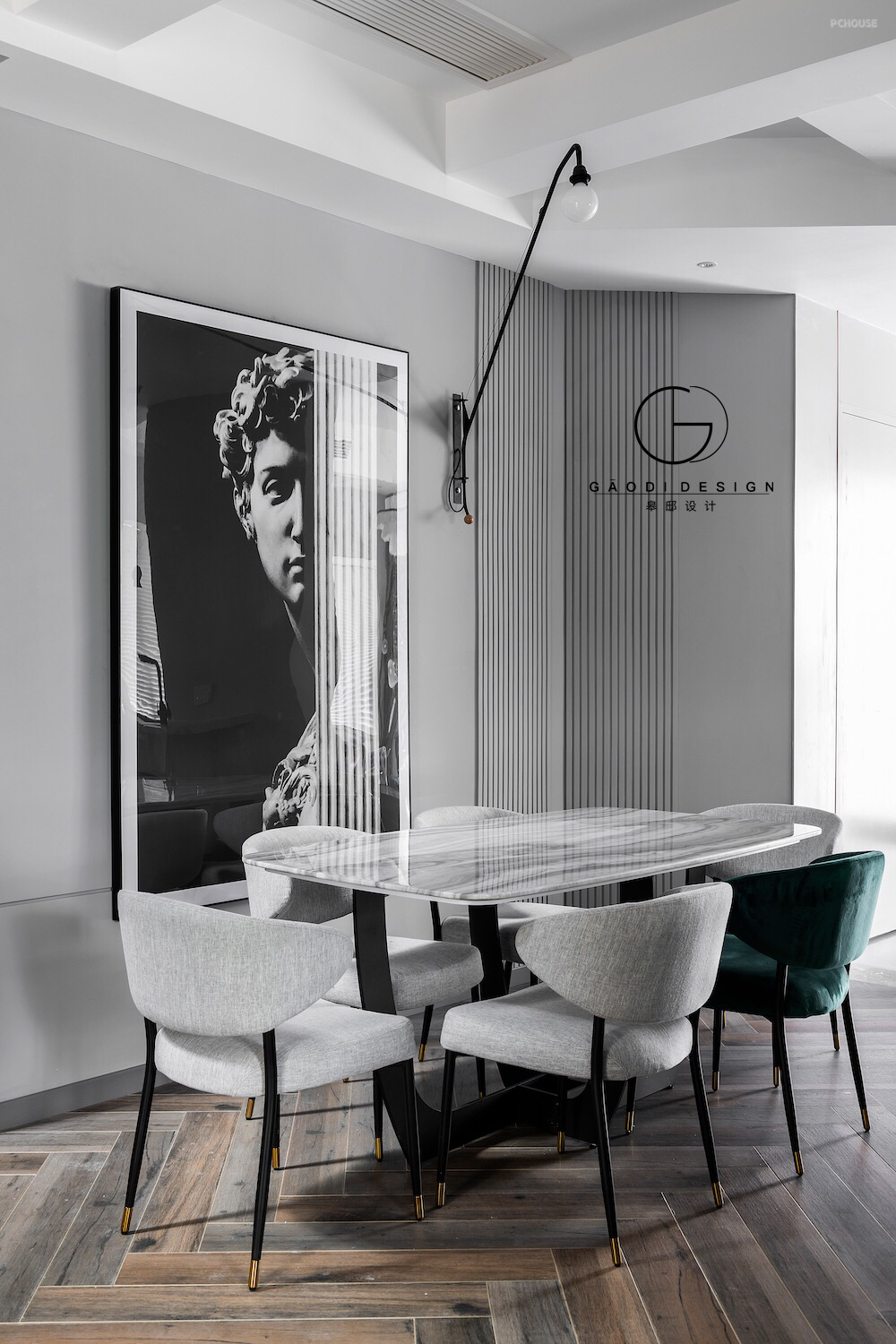 餐厅的背景墙设计师经过反复考虑,最后决定就挂一副大的装饰画,不会显得冗杂,而且选的是这种给人沉静感觉的,无形中又添了些高雅的艺术感,这个地板,采用的人字拼,单调的地面产生了立体感,而且是用的不同色泽的地板搭配,很有层次感