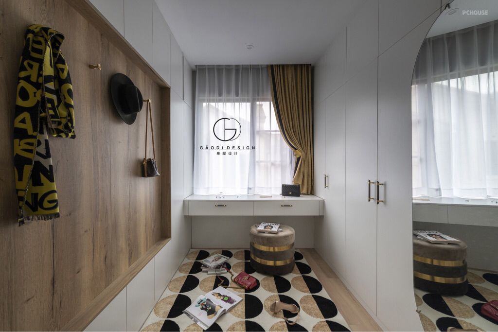 主卧旁边就是衣帽间,两边整齐的衣柜,配上宽大的梳妆台,能满足女主人对储物空间的要求