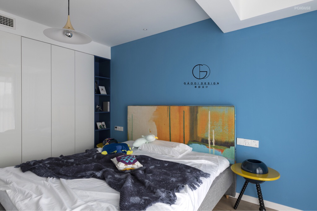 儿童房用的蓝色系,因为孩子喜欢蓝色,床头板用的色彩十足的,模仿调色盘那种感觉的,很活泼,和其他房间一样,儿童房也有大大的玻璃窗,清晨的阳光照进来就很舒服