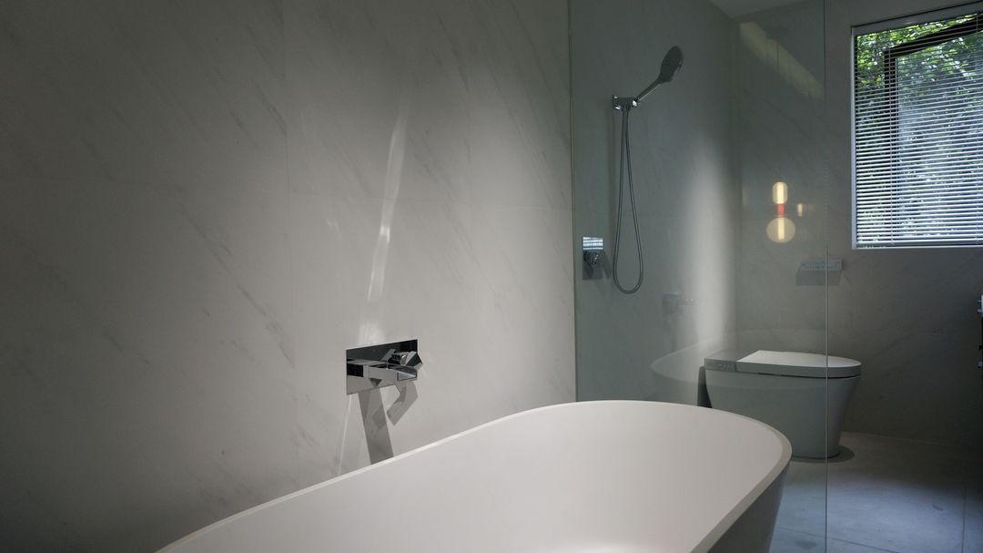半开放式设计的主卧室卫生间强调了空间的连续性