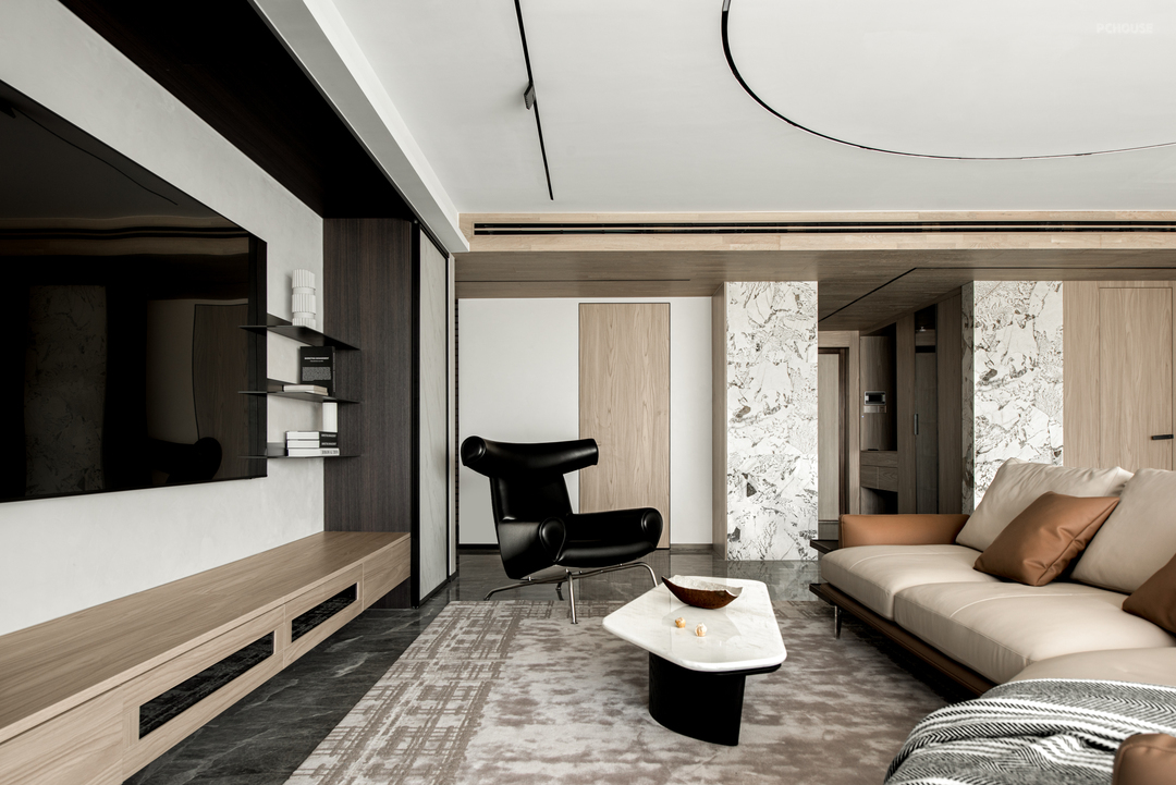 空间以黑白及米色为底,用现代性的「留白」打造空间的韵味,以「可生长的」大理石铺设出了雅奢调性,适应了会迅速迭代的审美。可以说,客厅塑造了一种轻盈飘逸的质感。