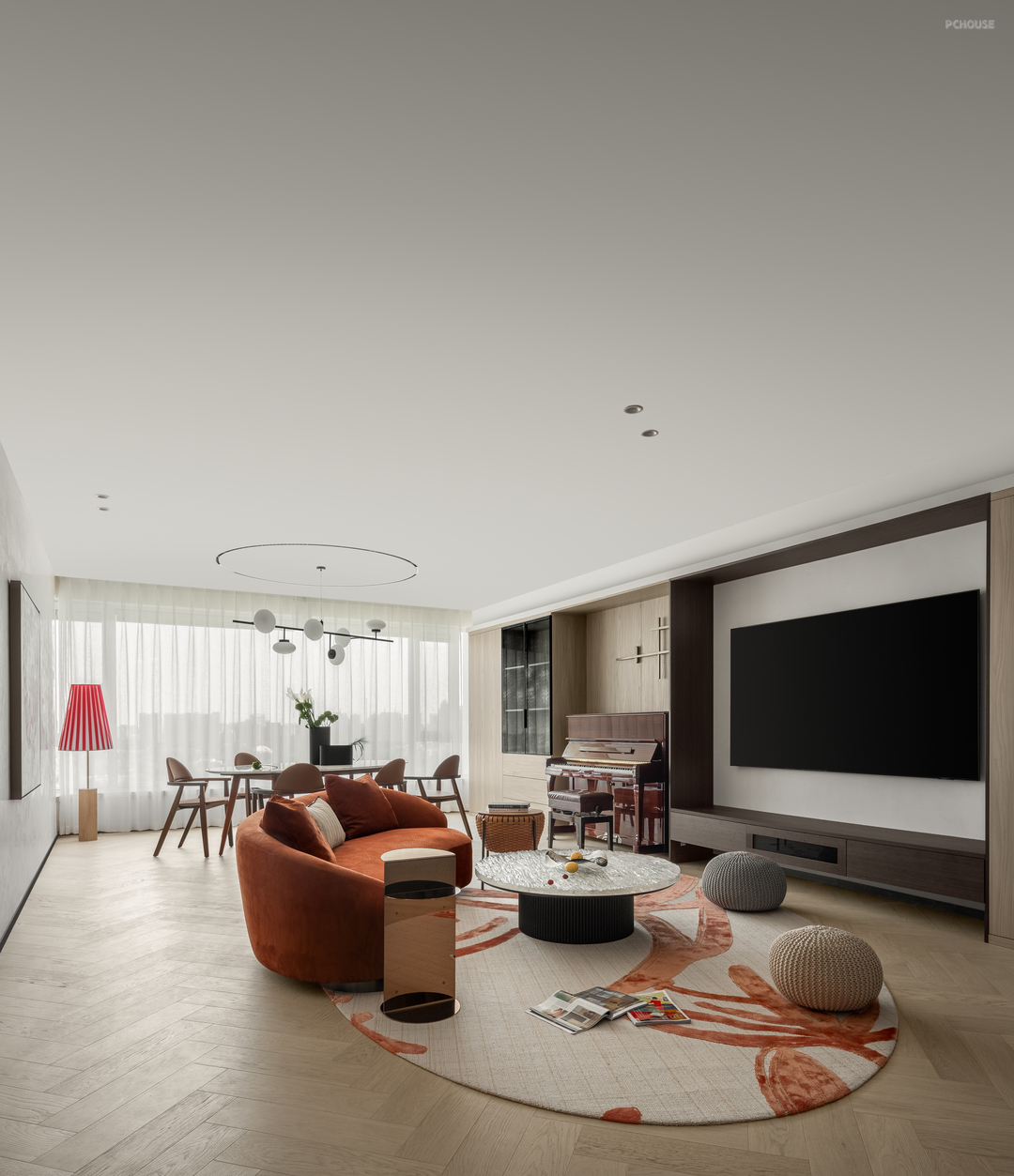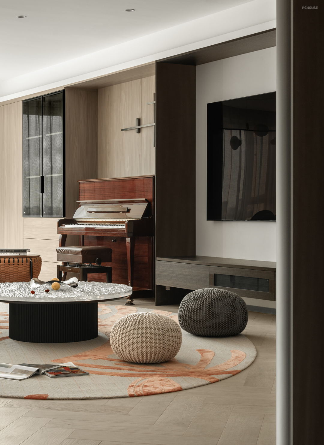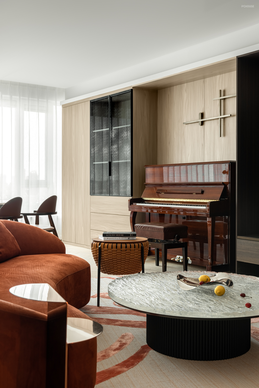 在软装的选择上设计师更是致敬艺术,致敬神奇自然。地毯《燃》这幅作品被评为汉诺威最佳设计奖,作品由浩瀚荒漠、顽强生长的植物、绚烂的红等元素构成,与波光粼粼的茶几穿插对话。顷刻间,新与旧,当下与未来,形成了鲜明和独特的空间语言,即在温润雅致中寻找与自然平行的新秩序。