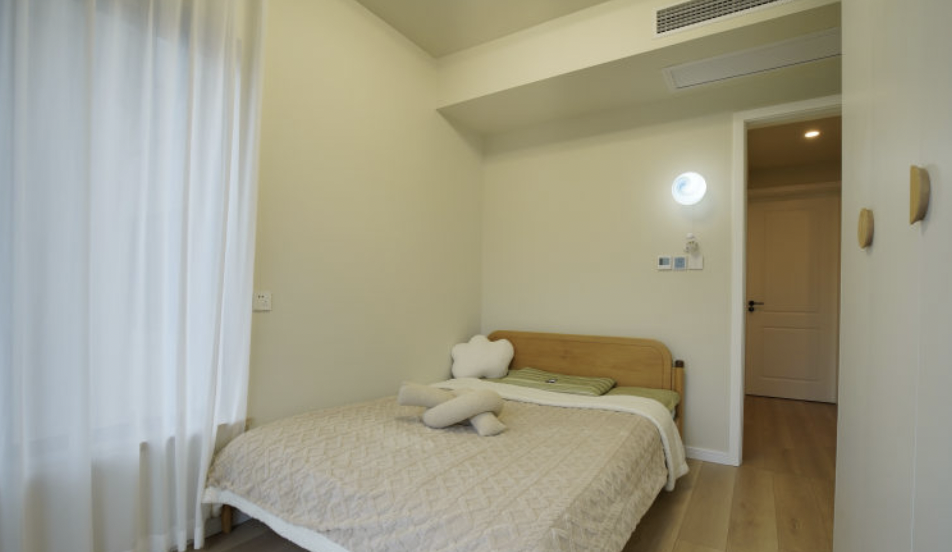 客厅以奶白色的素色为主,辅以亮色作点缀。绒布沙发+无茶几设计,客餐厅采用奶油色原木地板与简约白色定制柜的组合,瞬间点亮整个空间,加之暖色的灯光呼应,使客餐厅的氛围更加温馨治愈。