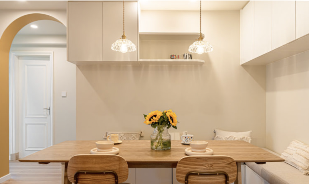 两个玻璃吊灯的点缀 ,让空间不显沉闷,增加了一丝乐趣。为避免单一颜色的审美疲劳,我们特意选择了跳色设计的白色餐椅坐垫进行搭配,桌面再辅之以向日葵点缀,色彩层次得以丰富,也加入些许自然气息。