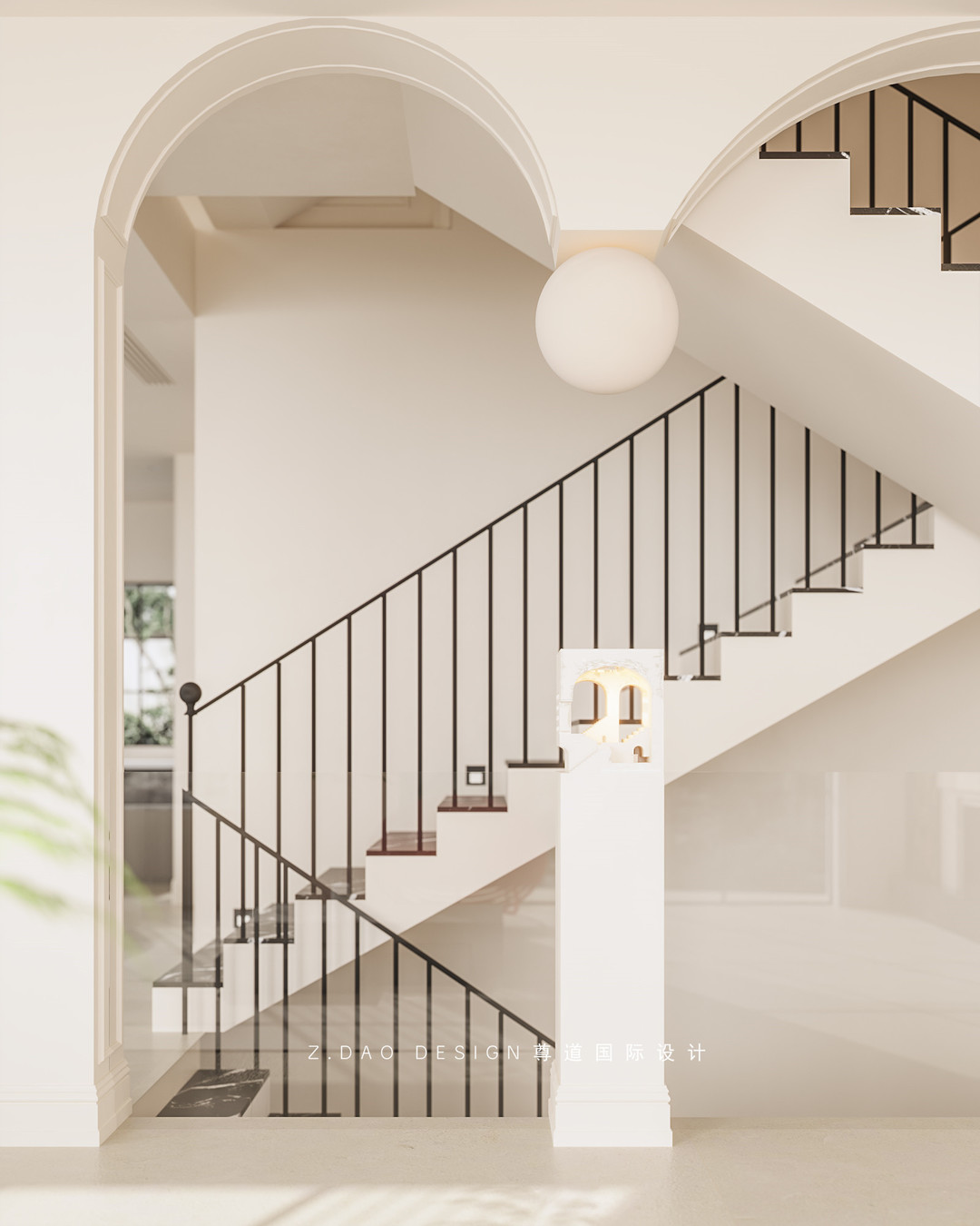 一入户可见双拱形门洞,悬挂的球形灯和嵌入式石膏灯,法式氛围感直接拉满。