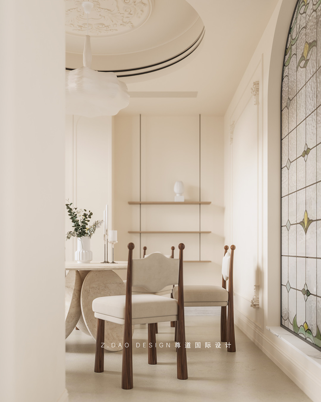 拱形艺术玻璃窗户的造型柔美又富有空间感,铁艺的框架又不失精致。