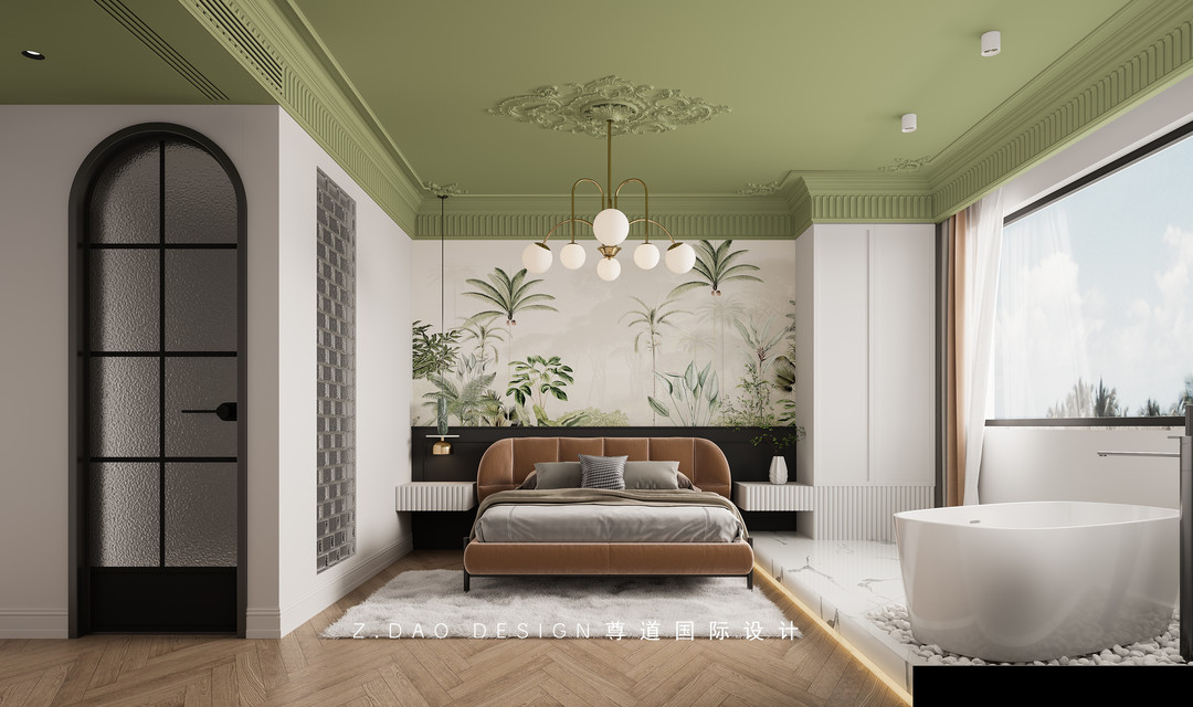 房间吊顶是最大的亮点,顶面装饰上使用经典的饰花灯盘,在吊顶边走了一圈顶角线与波浪板,莫兰迪绿吊顶与白色墙面给人一种抹茶冰淇淋的感觉,让人清凉一夏,有种简约浪漫的氛围感,打造出浪漫轻盈的生活空间。