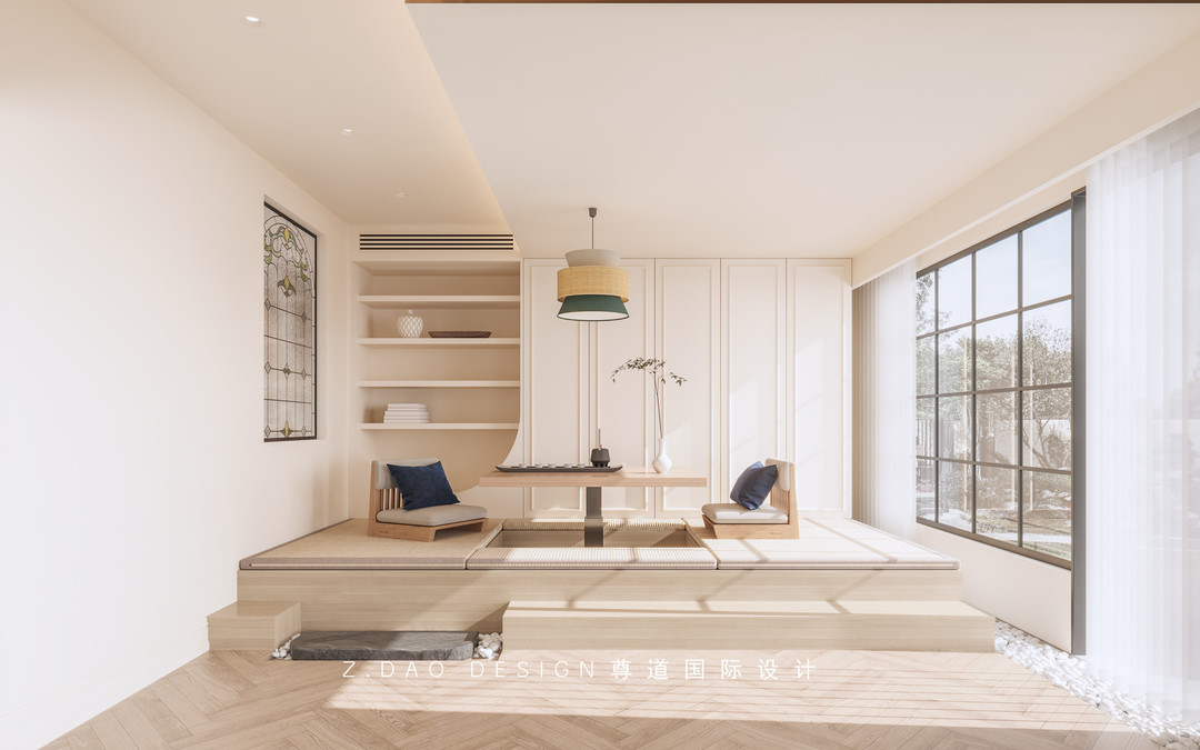 榻榻米比原地面相比有抬高,不用担心坐地上着凉,靠墙一侧做到顶柜与开放格结合形式,满足储物功能需求的同时,也增添美观观赏性。