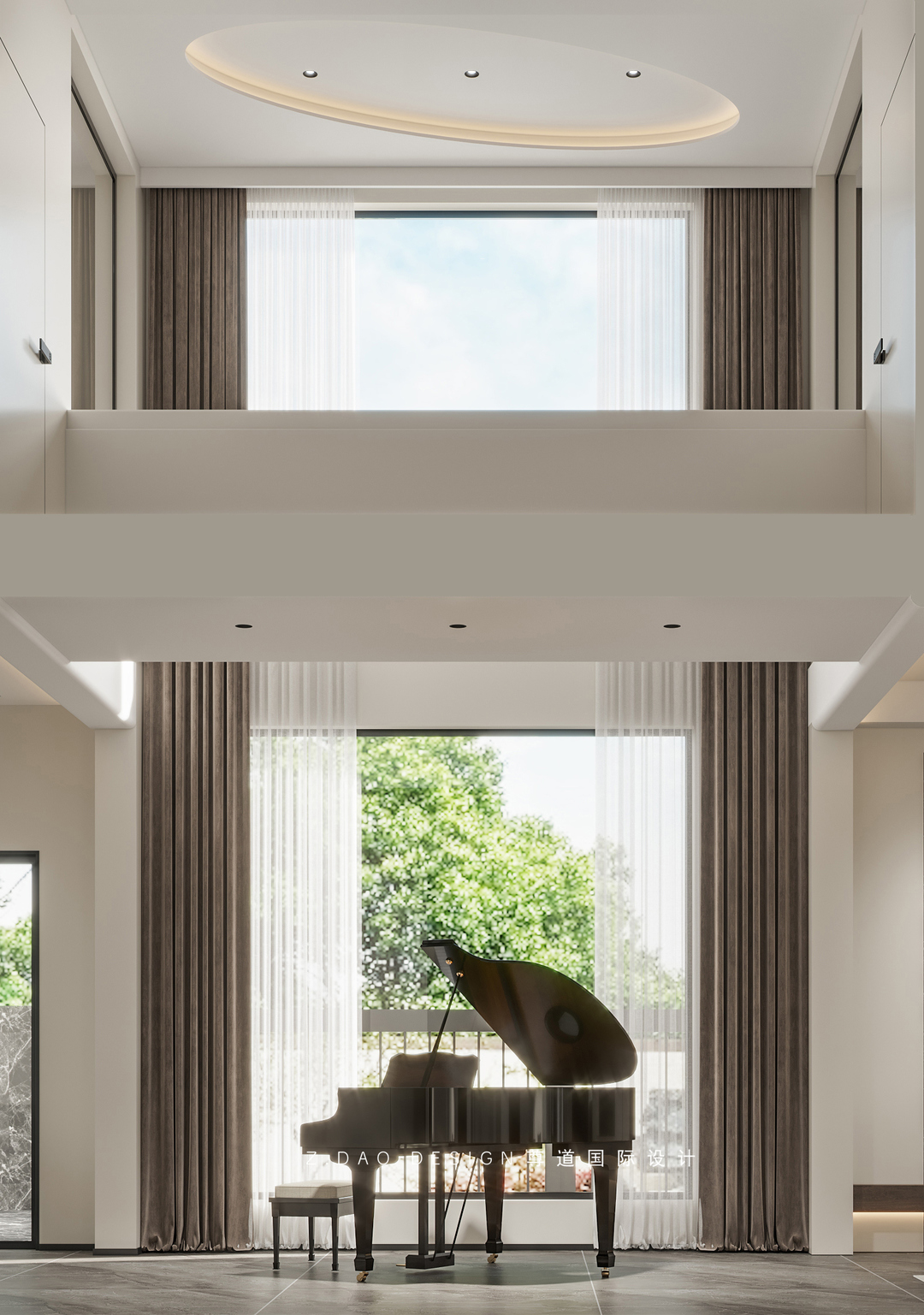 钢琴区做挑空,让一层与二层有互动与连贯性,楼梯上的跳色与长短不一的台阶呼应钢琴的黑白琴键。