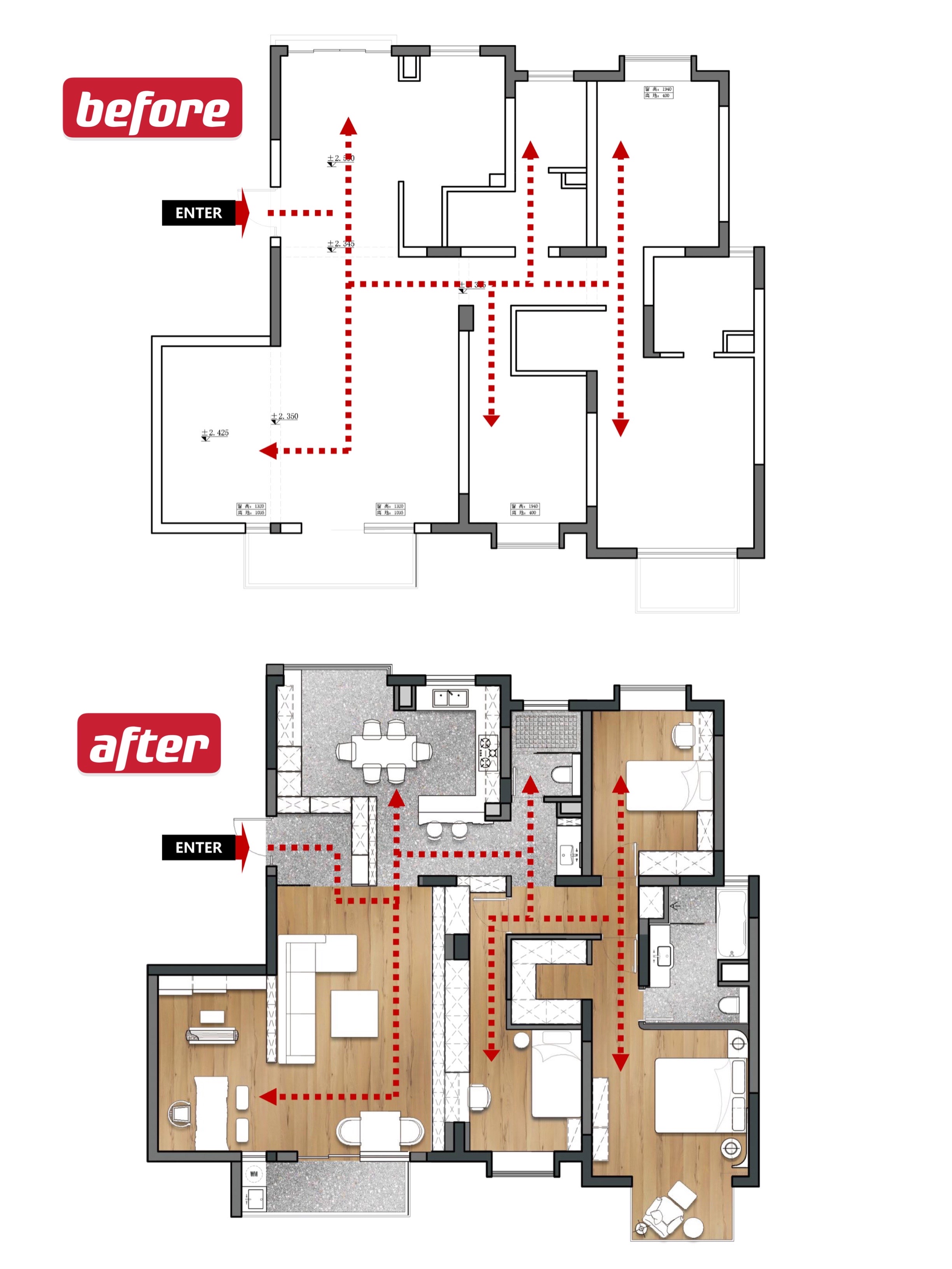 必须明确的一点是,改变动线的目的不是让它变成另一套房子,而是为了生活的舒适和便捷,变成了另一套房子则是改变动线后导致的结果。