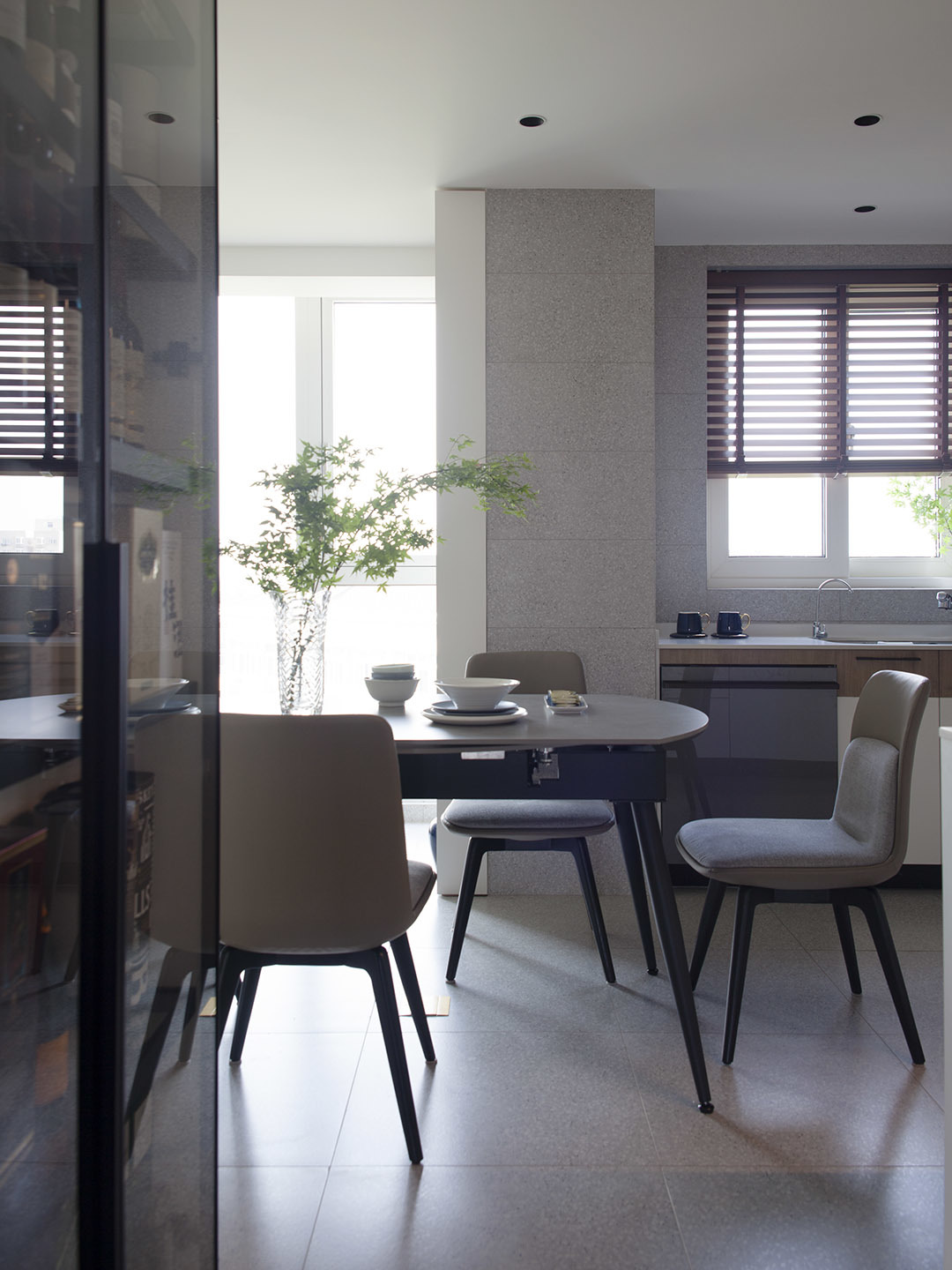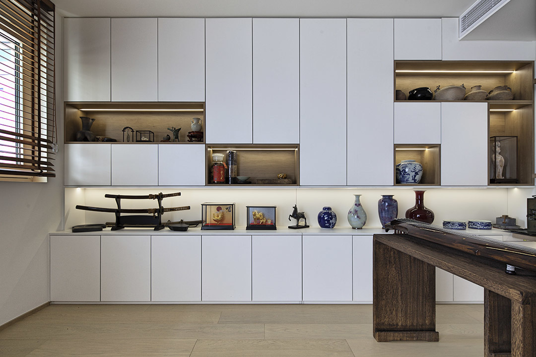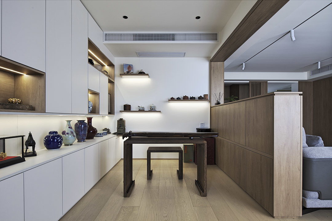 我希望通过空间改造、色彩、材质来营造不见中式元素,却处处见中式的整体氛围,在此间能体验“焚香点茶,挂画插花”的风雅之事。所以除了几样要保留的老家具和业主的收藏品,全屋几乎见不到任何中式元素。