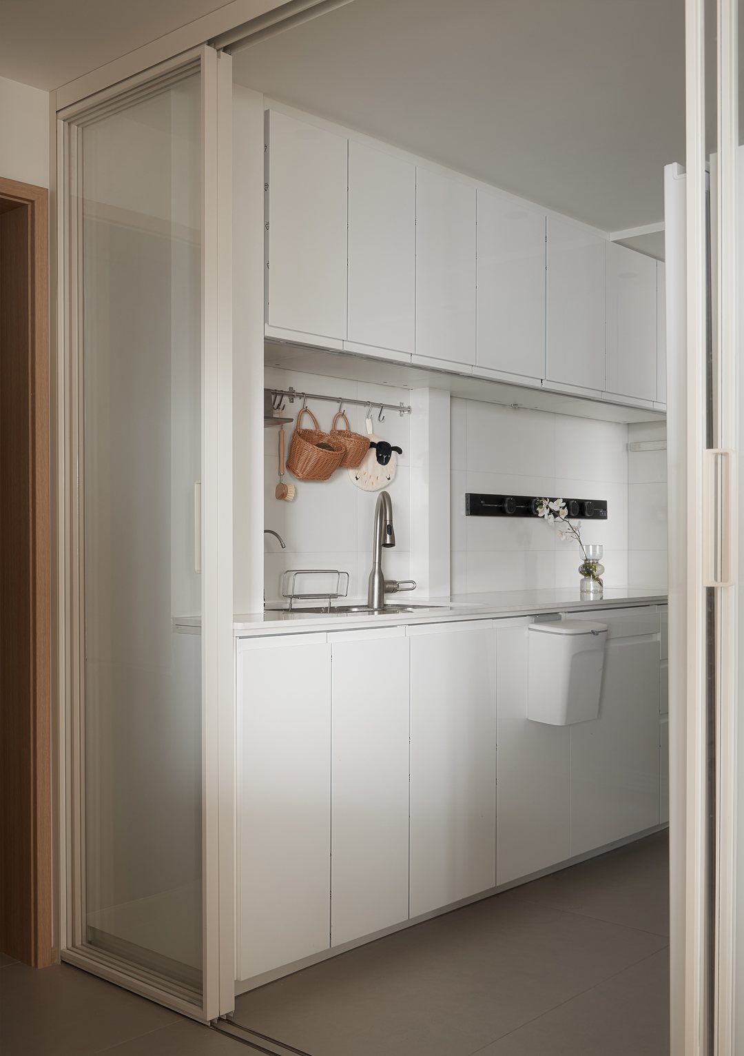 屋主一开始想要开放式的餐厨设计,结合空间和采光问题的综合考量,他们接受了把厨房单独划分,选用可开可合的玻璃移门达到半开放式的效果,还可以更有效的避免油烟;U型橱柜布局把冰箱加入空间,与玄关柜统一色调的白色门板也可以提亮空间,