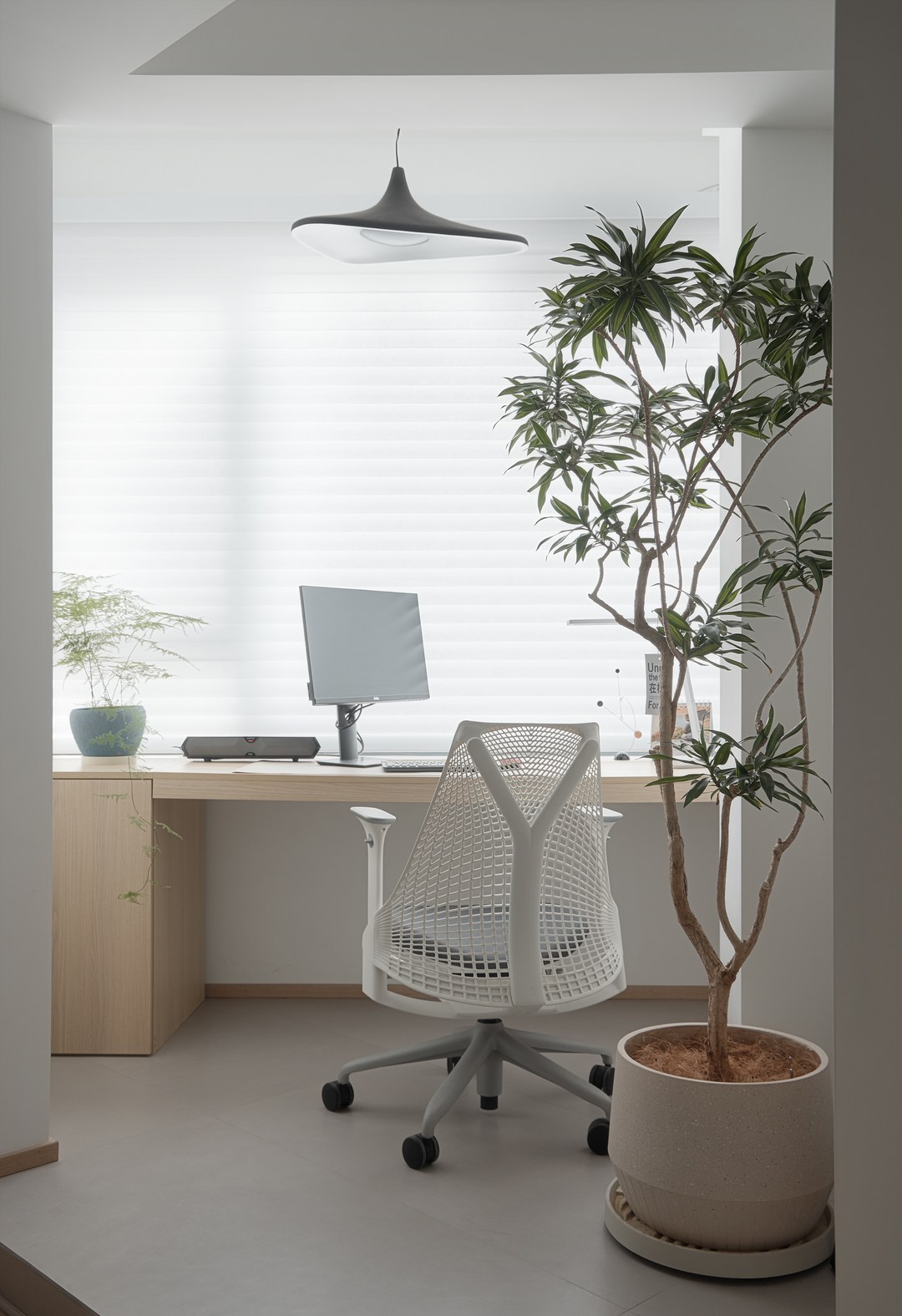 餐岛里面的阳台是个三角斜面区,通过地面抬高处理把它改造成开放式的书房,不仅可以满足屋主夫妇日常居家办公区所需,还有窗外美景以及远处眺望的绝佳位置,这个小空间的利用做到了极致,既有了功能区又兼顾美观和室内采光;
