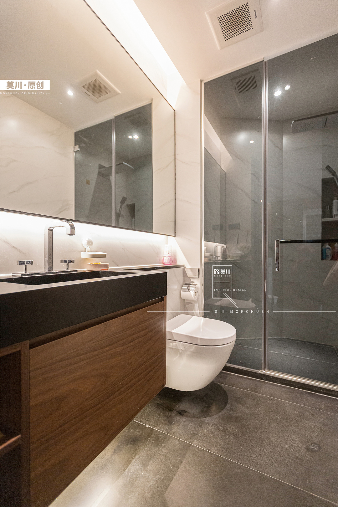 去掉采光不好的无用客房,用以改善公卫的空间尺寸和舒适度,将干区外置融合走廊空间,拓宽动线宽度,既改善走廊狭长问题又释放净手功能。内区淋浴与马桶左右分隔,隐蔽式水箱+挂墙马桶,不占空间还利用假墙解决收纳不足的小问题。