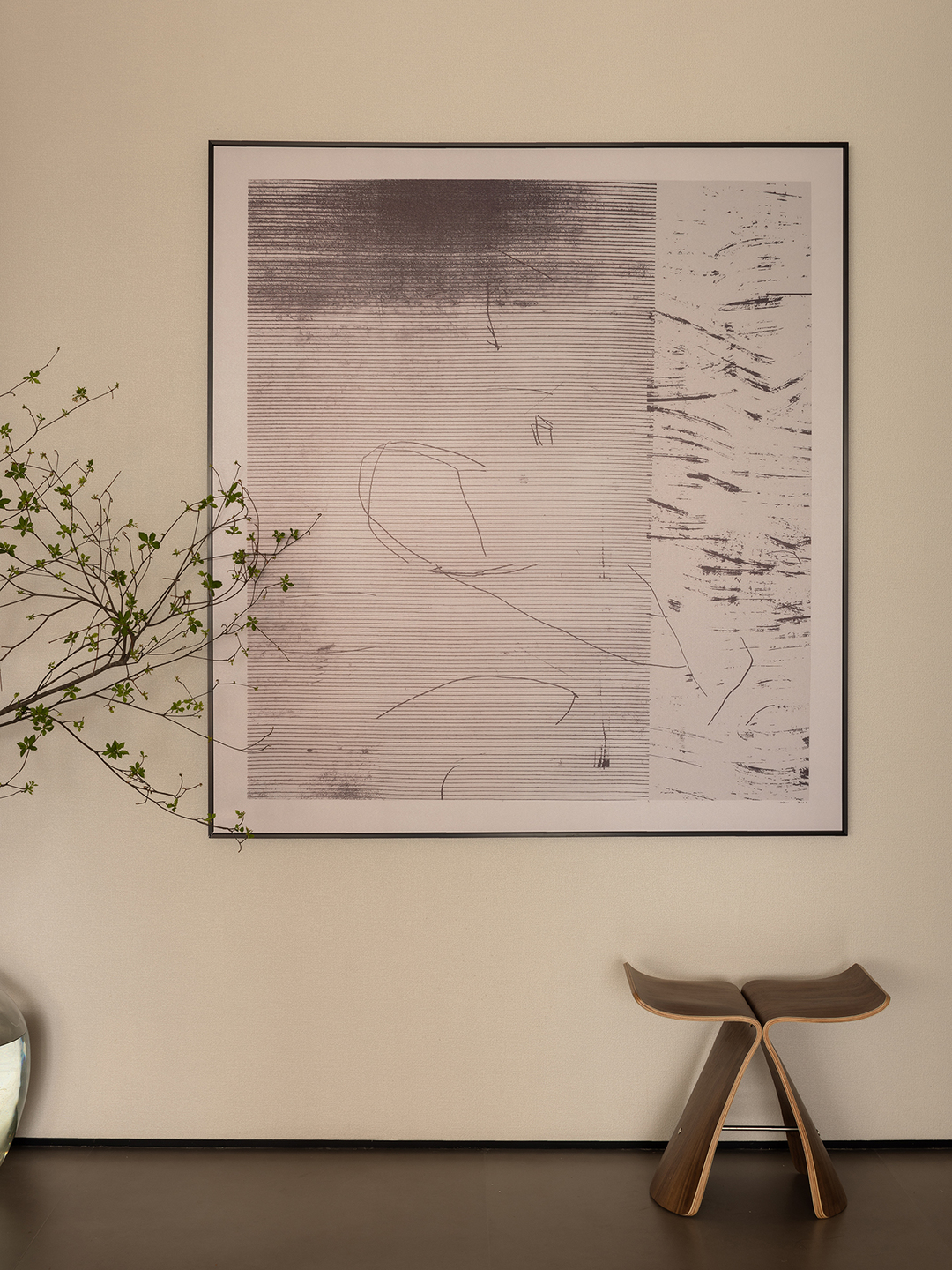 素,不止界定颜色,同样象征空间的表现力,从一开始进门的一幅画,一张换鞋凳,一个绿植都尽显素雅