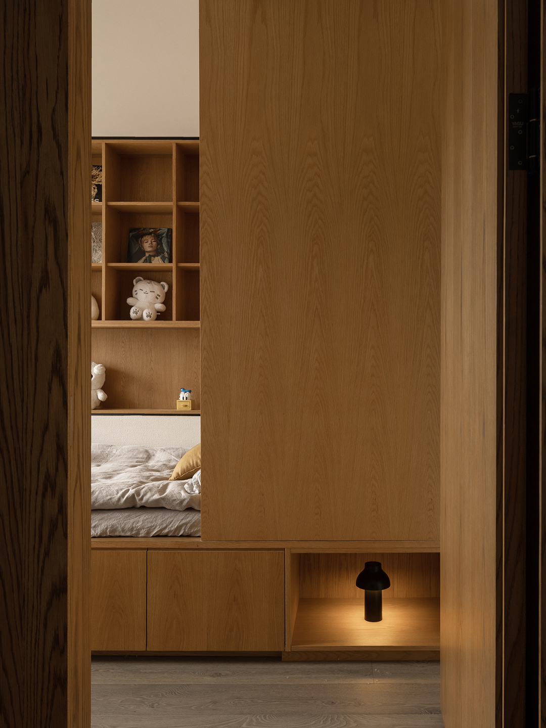 罗素说:“幸福生活在很大程度上必定是一种宁静的生活,唯有宁静的气氛才能蕴含真正的幸福。”在卧室的设计中,静不仅是听觉的标签,同样是视觉的符号。它以昏黄的灯光迎合木的本色,选取最为简素的色彩,铺垫温柔的情绪,空间以轻而缓的张力释放宁静的讯息。