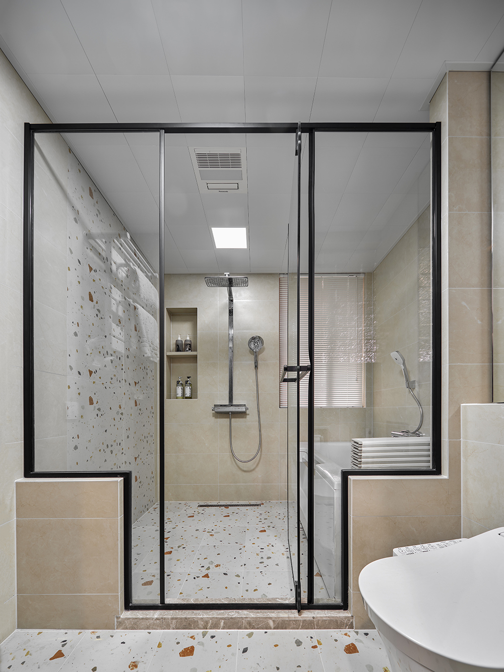 主卫湿区包含了淋浴、浴缸、坐便器的三重功能。空间相对独立,洗浴区采用玻璃门相隔。墙地面仿水磨石砖的使用使空间温暖但不失活泼。