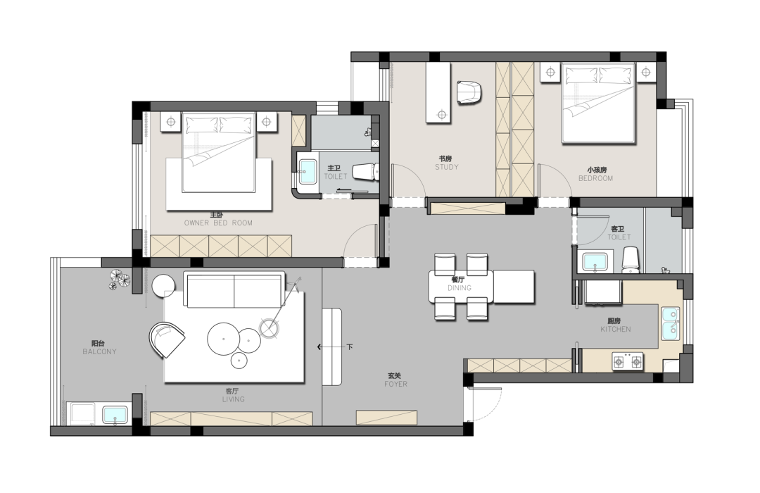 1、将客卫与厨房保持同一纵深,从而扩大餐厅区域;