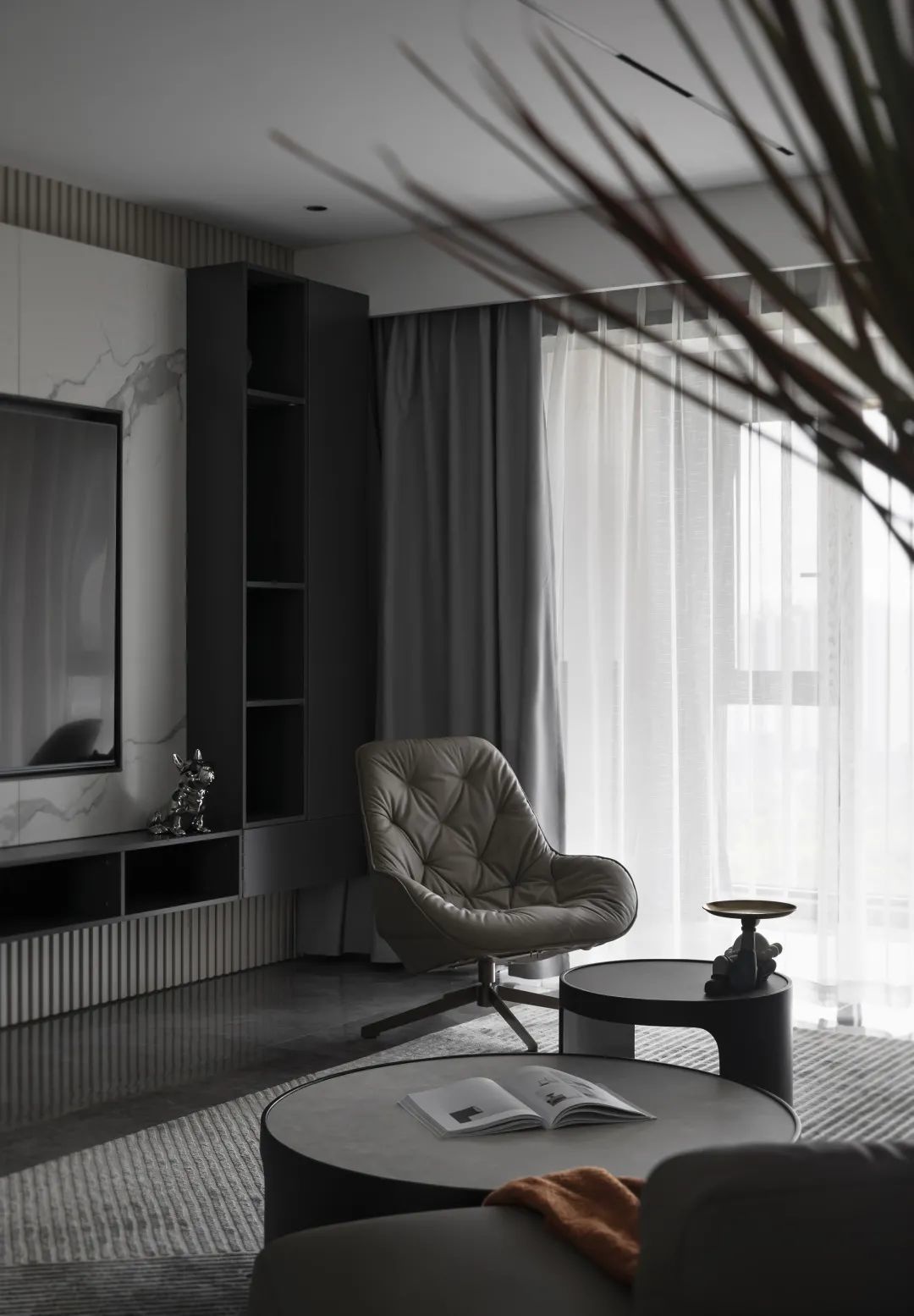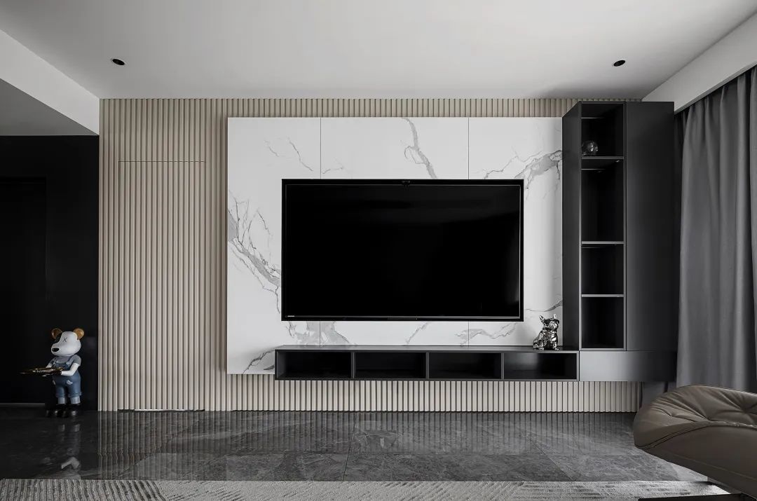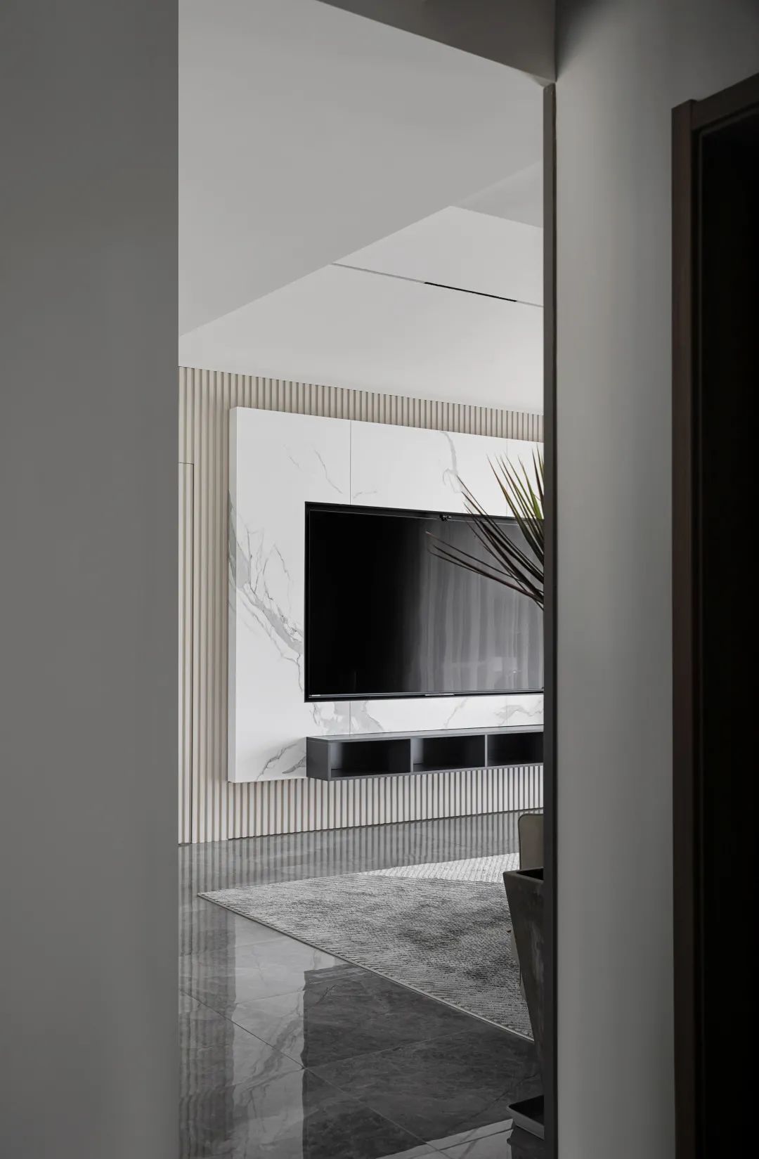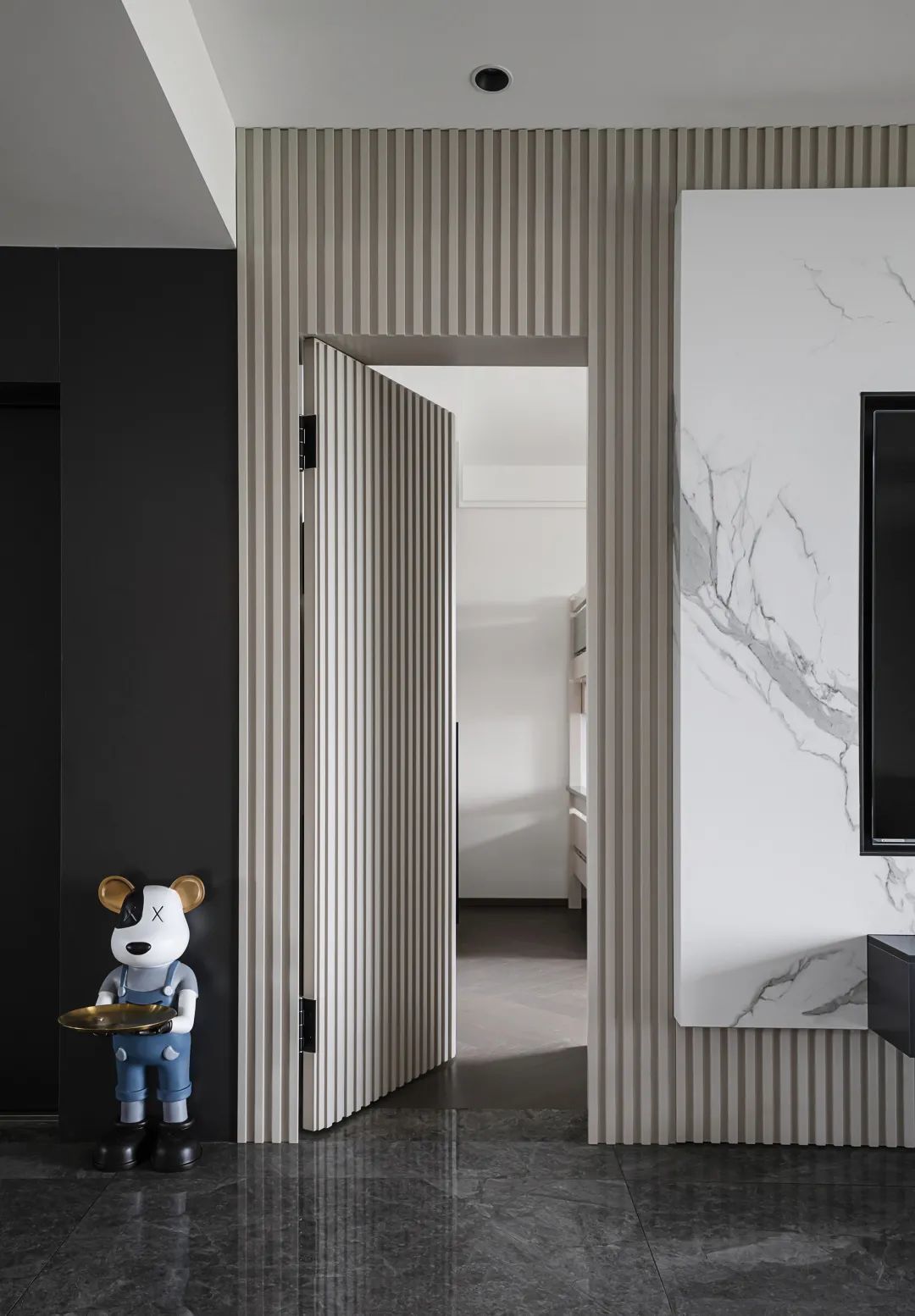 用色彩和材质界定功能,是一种空间秩序。电视背景延续格栅设计,叠加一层皓白水磨石纹岩板作为电视背景,黑色的睡L型定制柜用来陈列装饰,平衡了视觉的重量感,明暗深浅,精致简奢。背景墙后面是两个儿子的房间,设计师做了格栅隐形门,将门融入背景墙中,保证了立面简洁干净的视感。