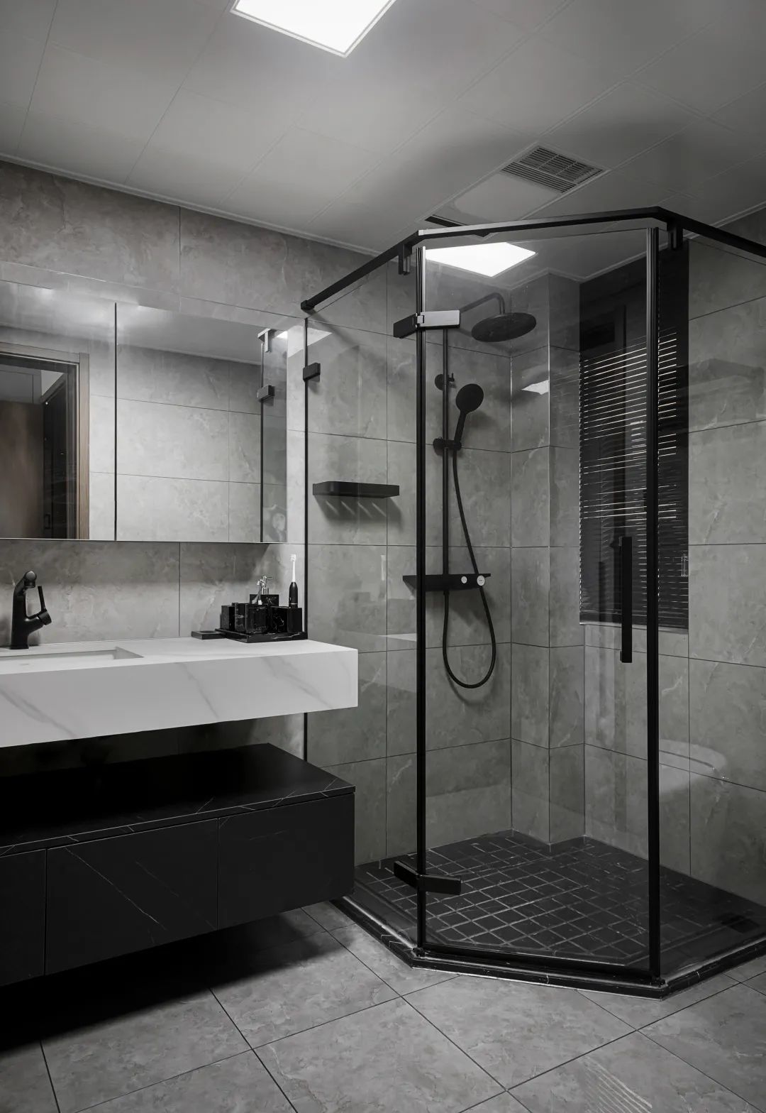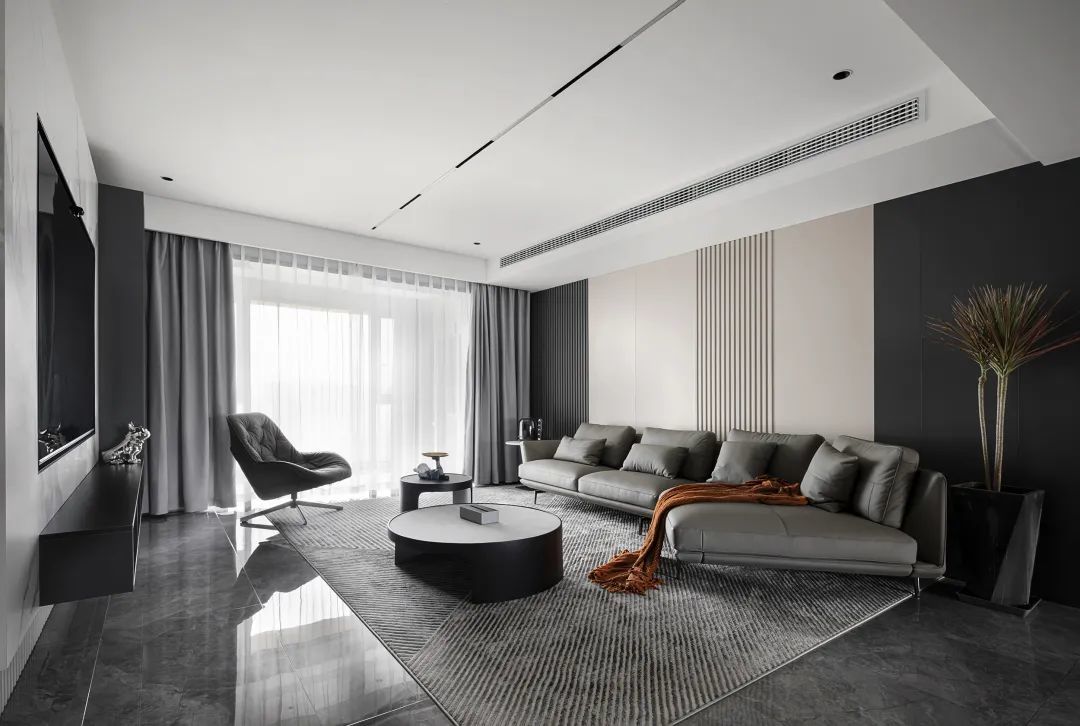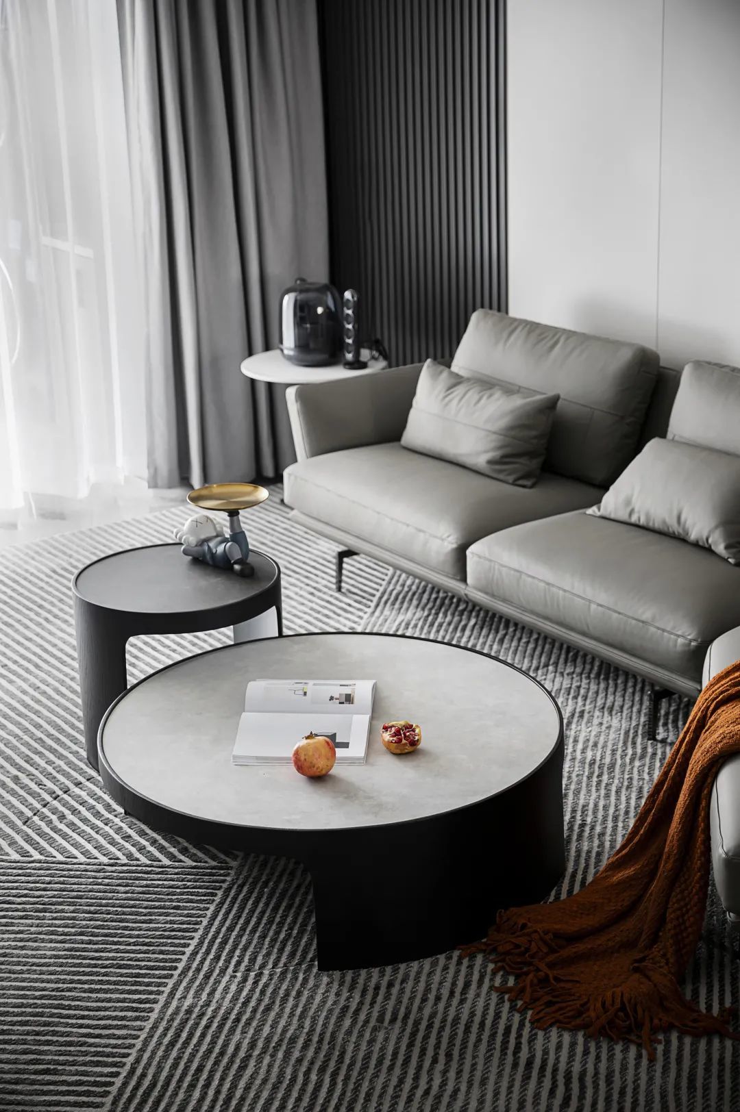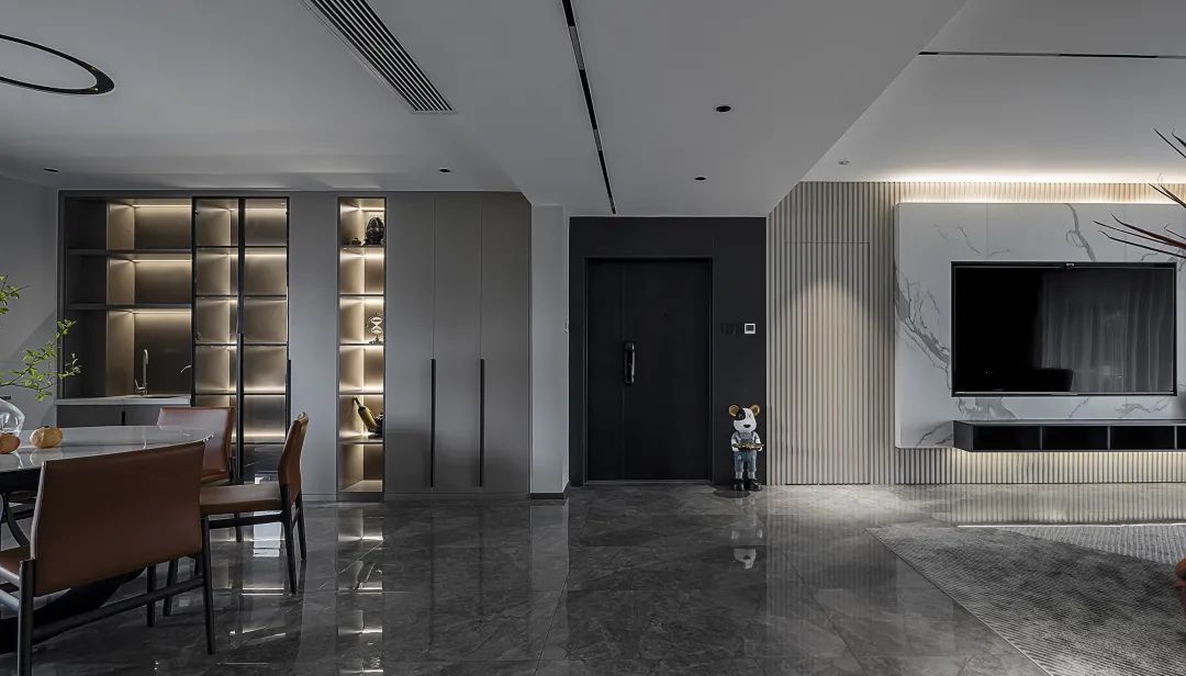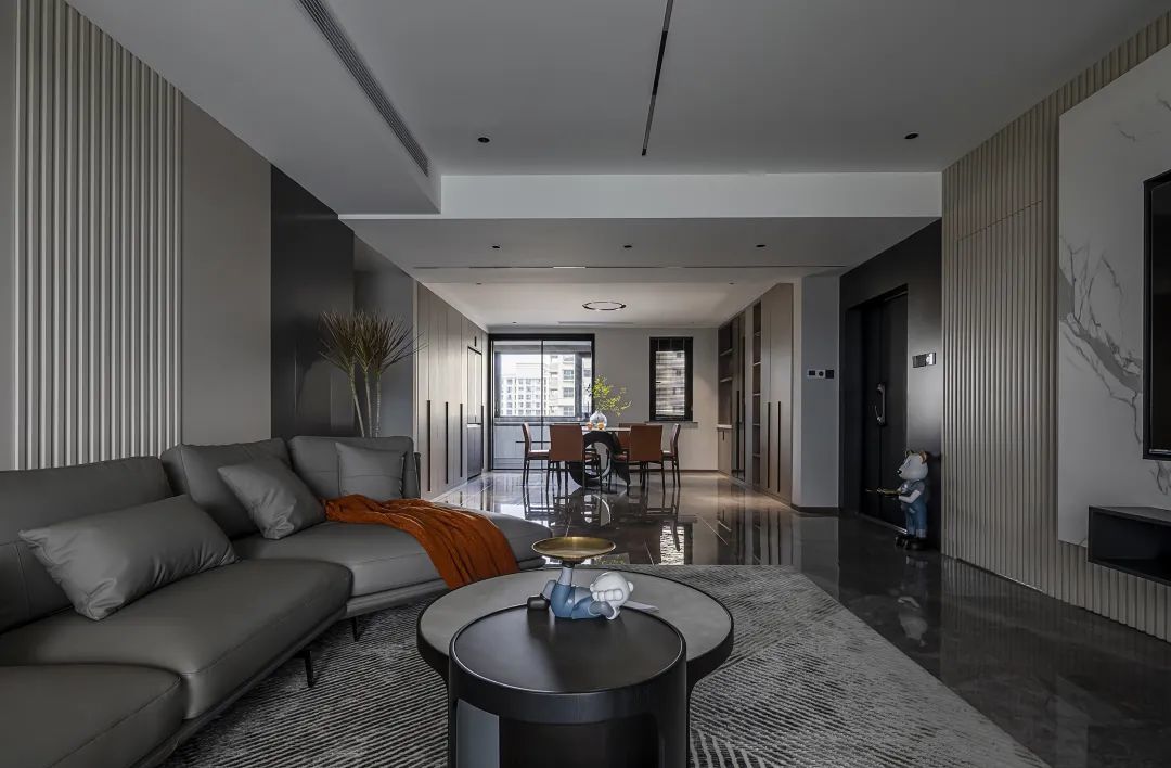 用色彩和材质界定功能,是一种空间秩序。电视背景延续格栅设计,叠加一层皓白水磨石纹岩板作为电视背景,黑色的睡L型定制柜用来陈列装饰,平衡了视觉的重量感,明暗深浅,精致简奢。背景墙后面是两个儿子的房间,设计师做了格栅隐形门,将门融入背景墙中,保证了立面简洁干净的视感。