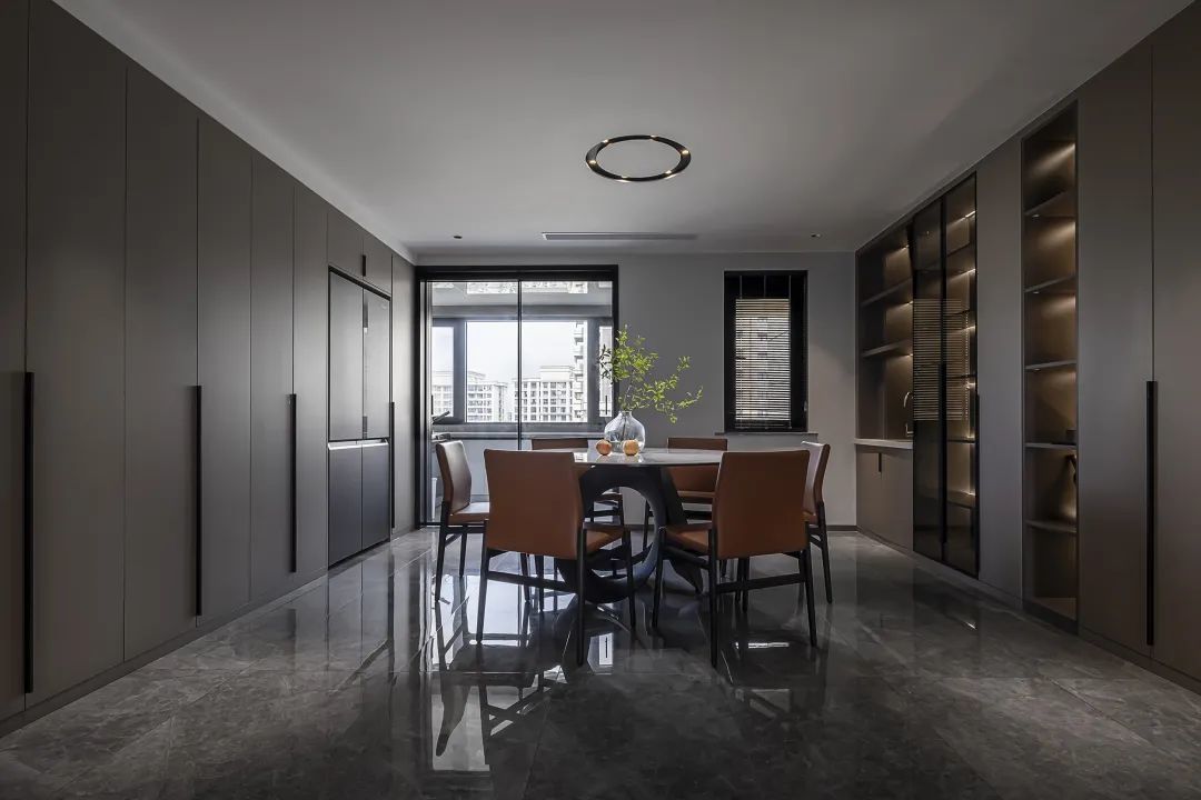 设计师在餐厅两侧墙面都定制了整面的通体储藏柜,茶玻柜门为藏酒柜,收藏业主的美酒佳酿;靠入户门的实木门柜体为鞋柜区,将庞杂凌乱的鞋帽杂物隐藏于无形。另一侧柜体与客厅背景拉平,80cm进深的超宽柜体,巨量收纳,也满足了业主对定制柜与冰箱尺寸的极致要求。