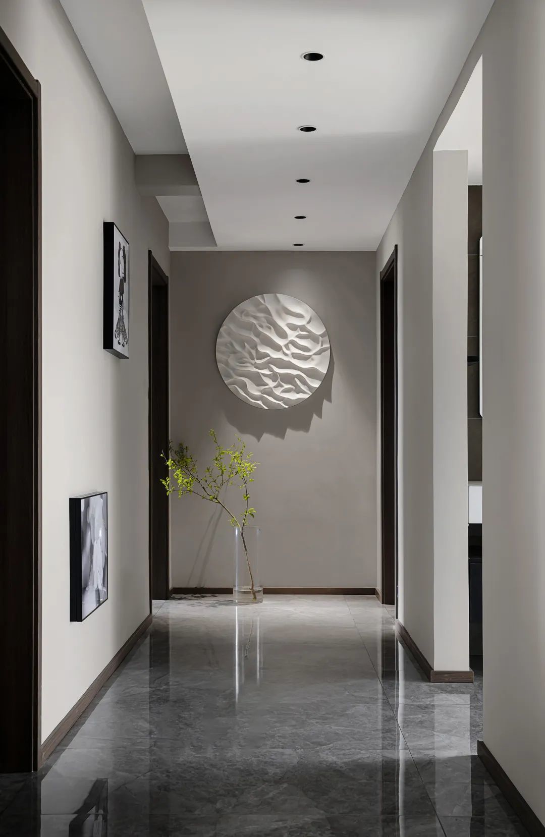 走廊是空间动静的分界,为缓解走廊顶部主卧与长辈房之间横梁的突兀感,设计师将廊道做吊顶处理,局部不对称的设计避免了满铺的单调感。廊道端景是一幅立体装饰画,在光影的点缀下,呈现出凹凸有致的山脉纹理。