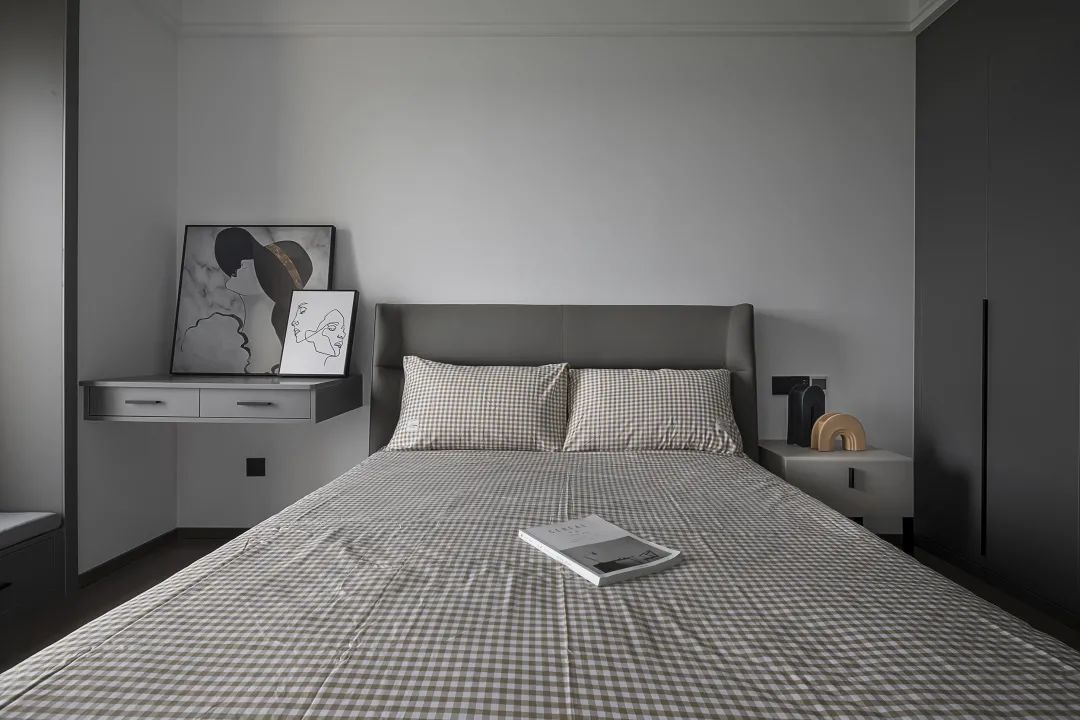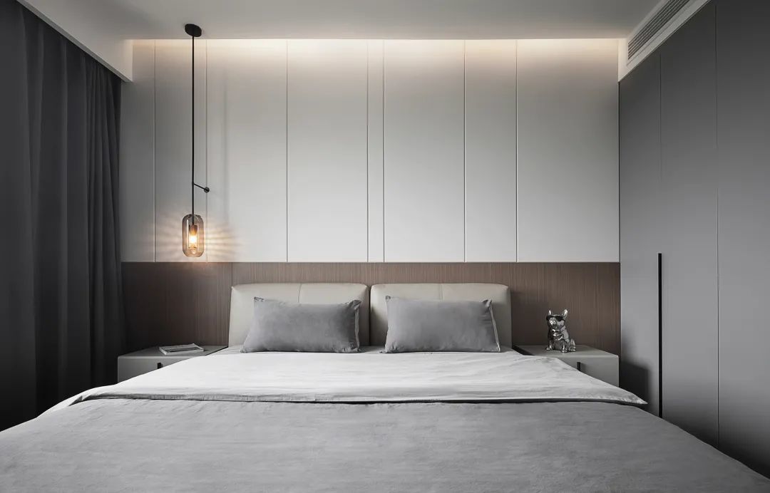 主卧是一个套间,延续了客厅黑白灰的理性,稍加原木床屏和暖光灯饰装点卧室的温馨氛围。背景木饰面的不规则寥寥几笔线条,将整体纯度打破,远观极美,近焦也足见设计细节处理的匠心态度。