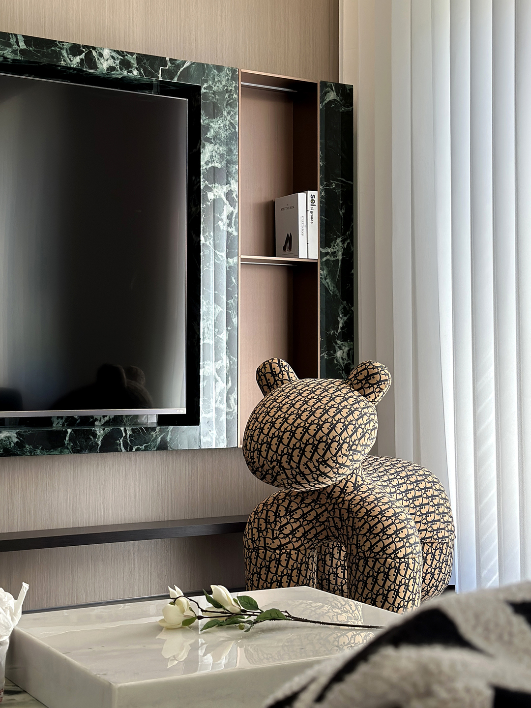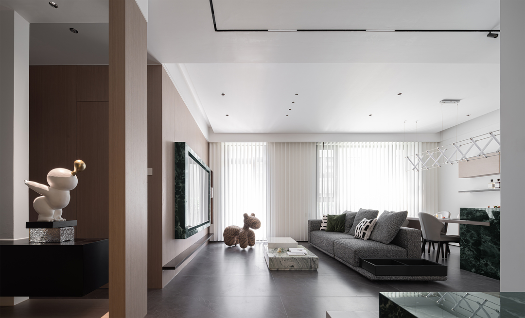 客厅、餐厅等主要空间采用浅木饰面,营造出清新淡雅的氛围。温润的色泽让人倍感舒适,仿佛置身于自然之中,局部搭配普拉达绿岩板,为空间增添了一份时尚与个性。绿色自然纹理与浅木色对比鲜明,视觉效果更加丰富。