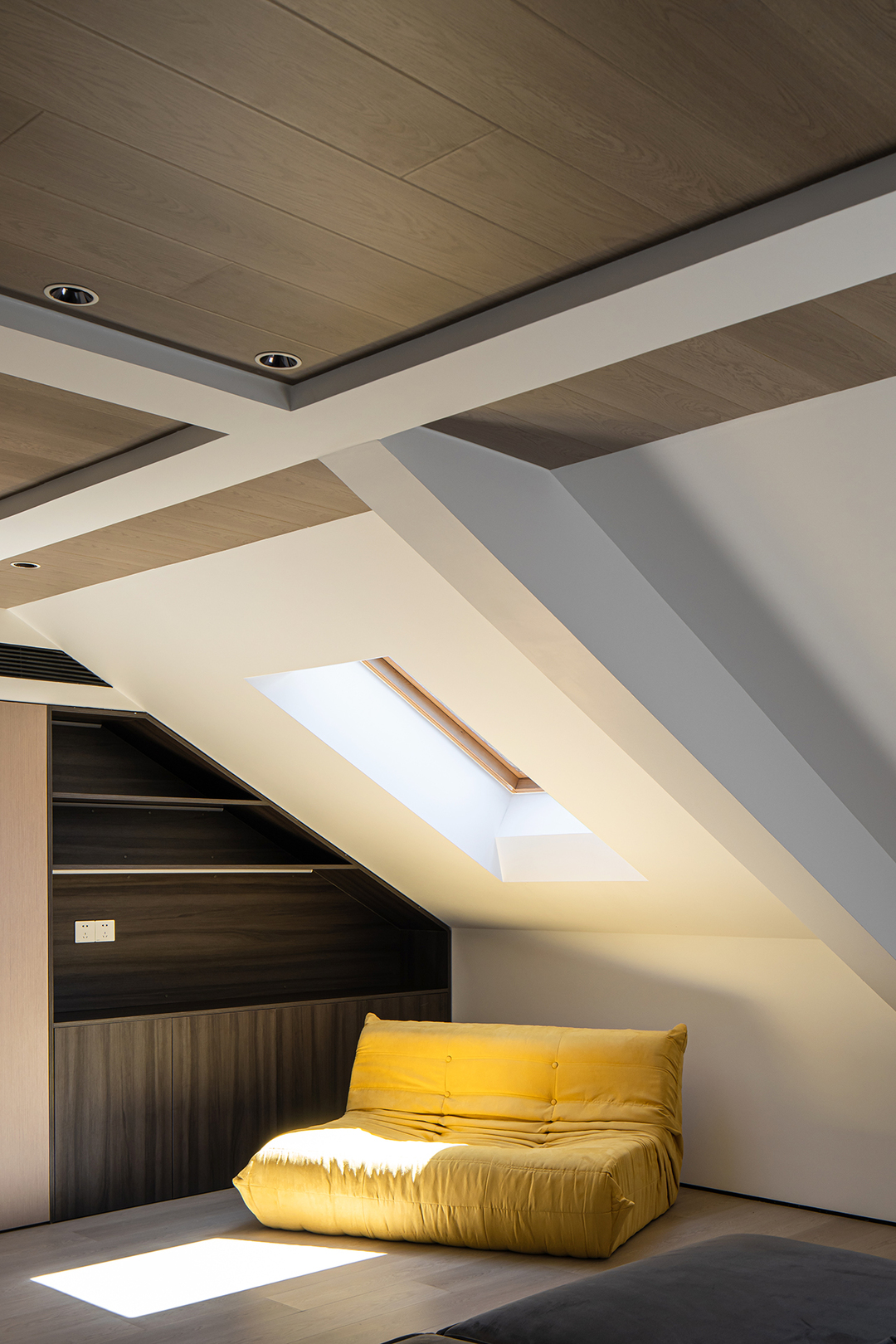 三层阁楼的设计,保留建筑结构原始骨架,最大化保持了原有空间高度,顶面以木饰面穿插横梁体块,赋予空间更多独特性,营造出别致的视觉效果。