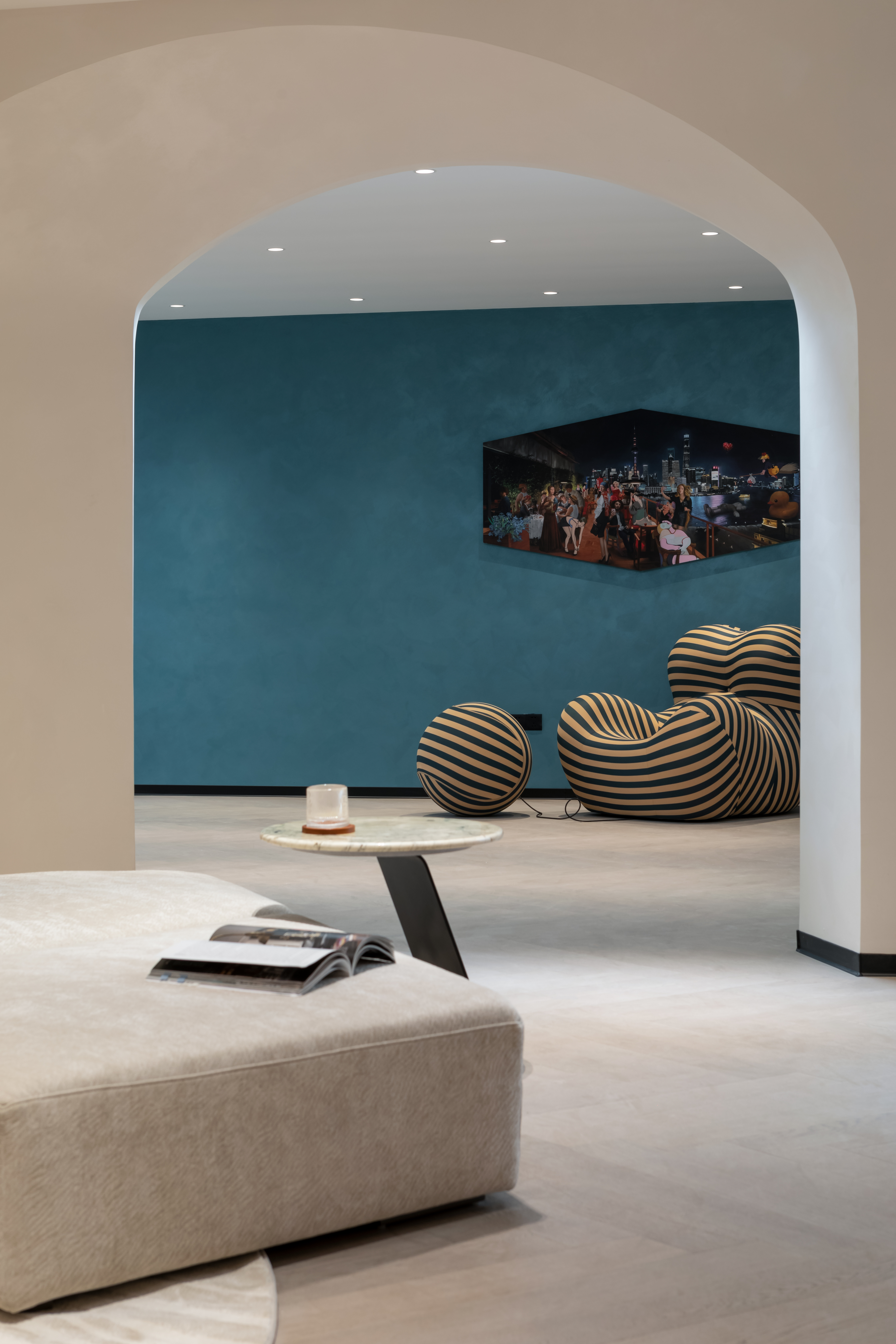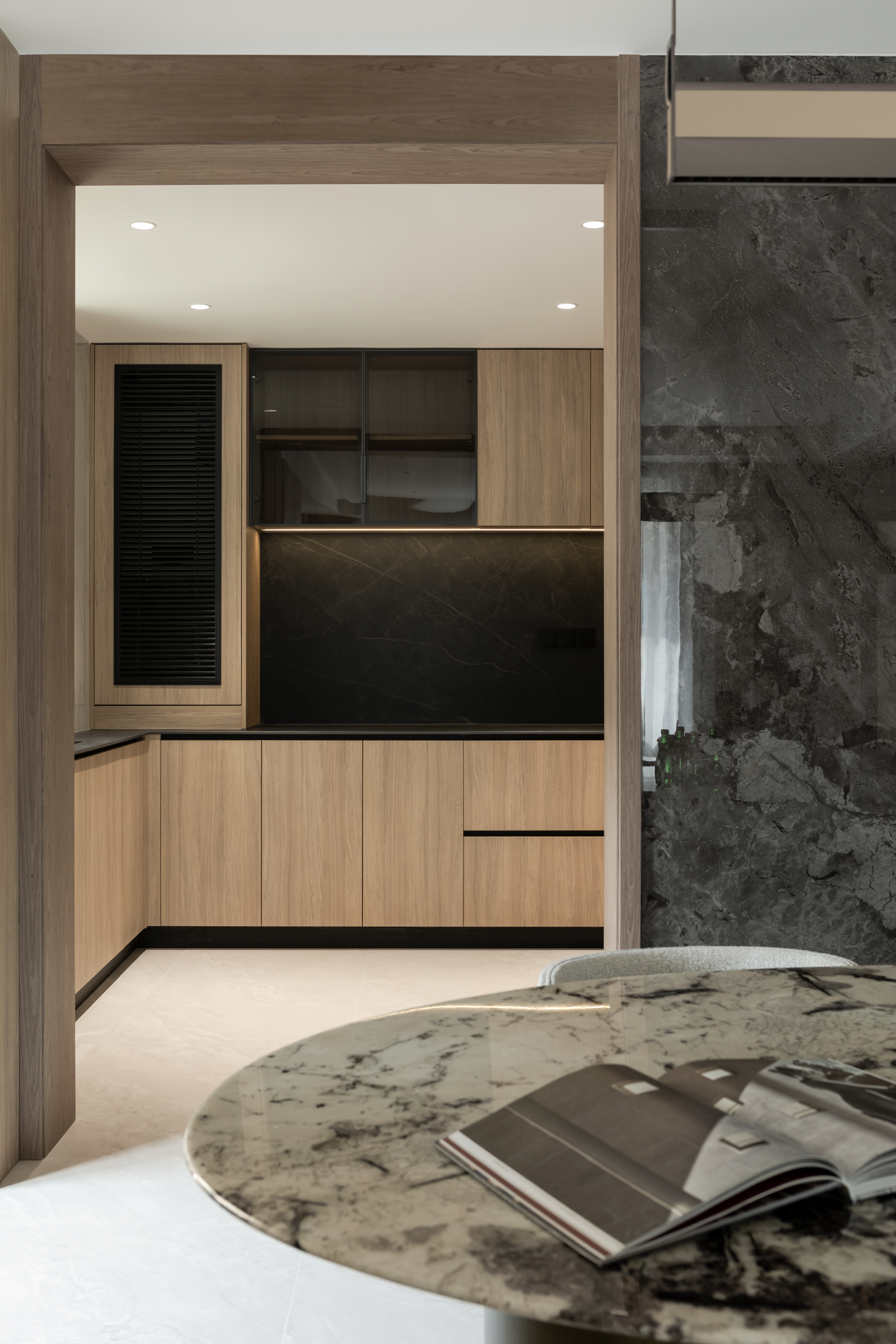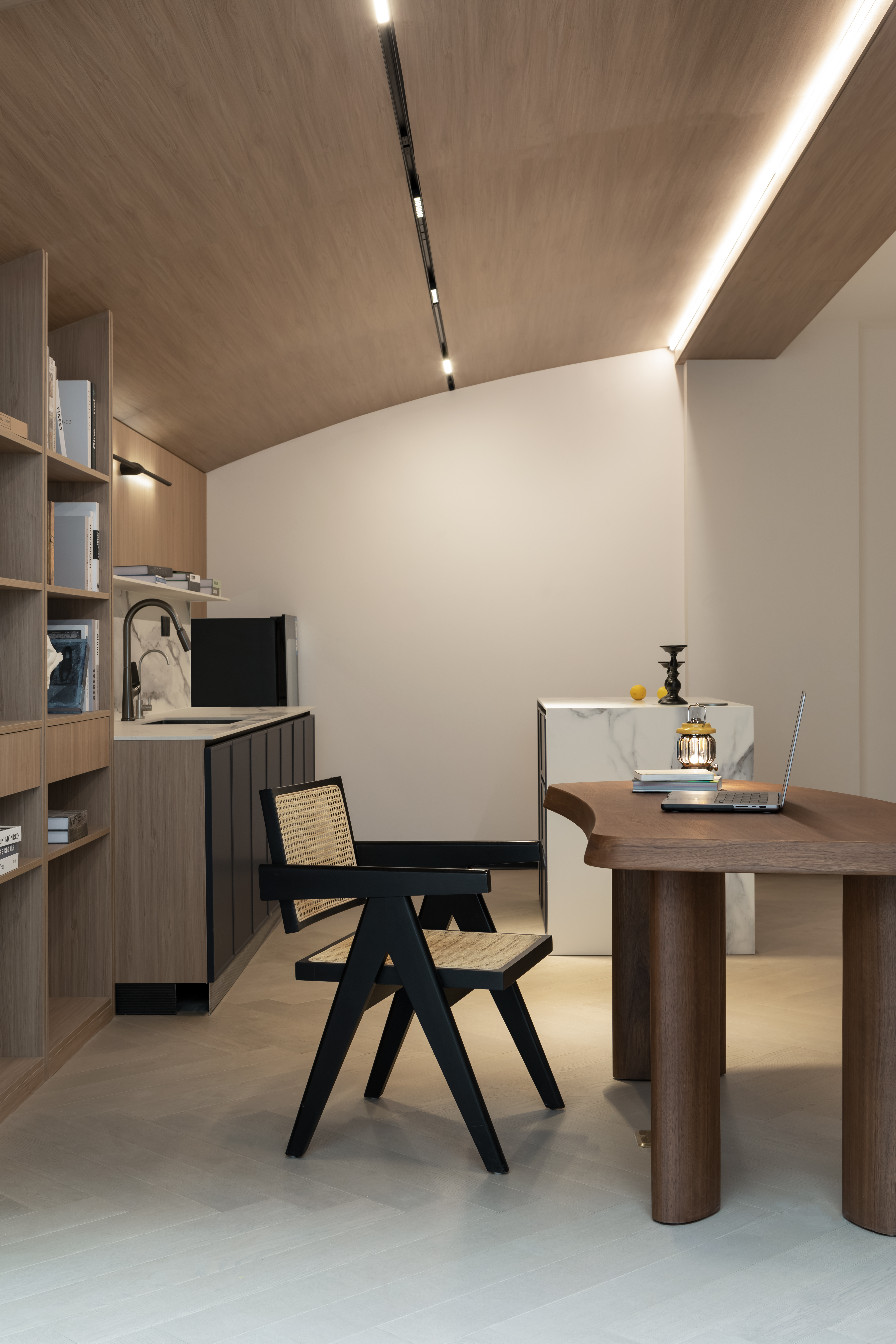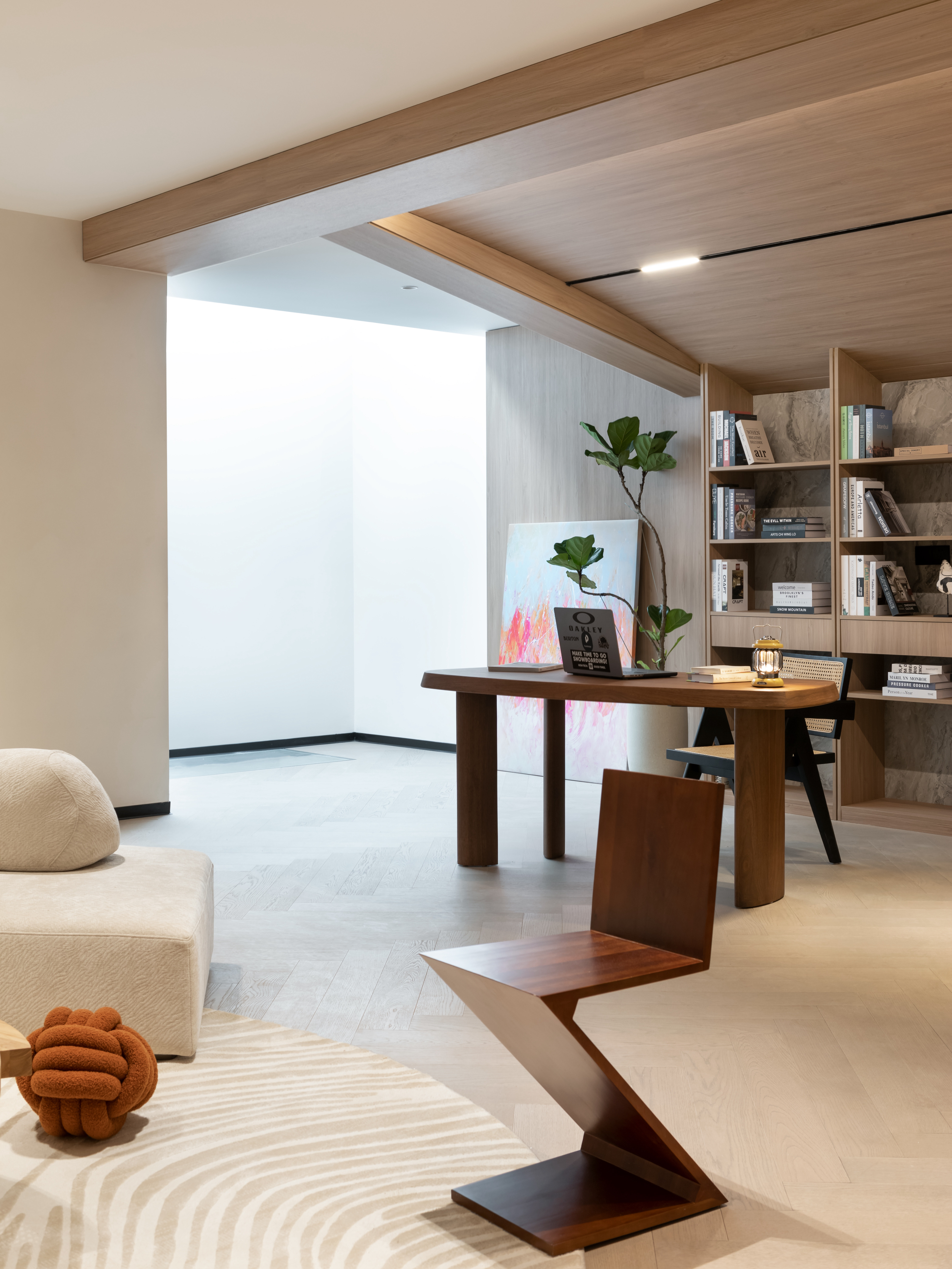 将整个地下一层打开,会客区与西厨互相融合,增加面积的同时让“实用性”和“美观性”渗透在设计的每一个维度中,一整面落地展示柜墙大大地满足了屋主对个性艺术品的憧憬..