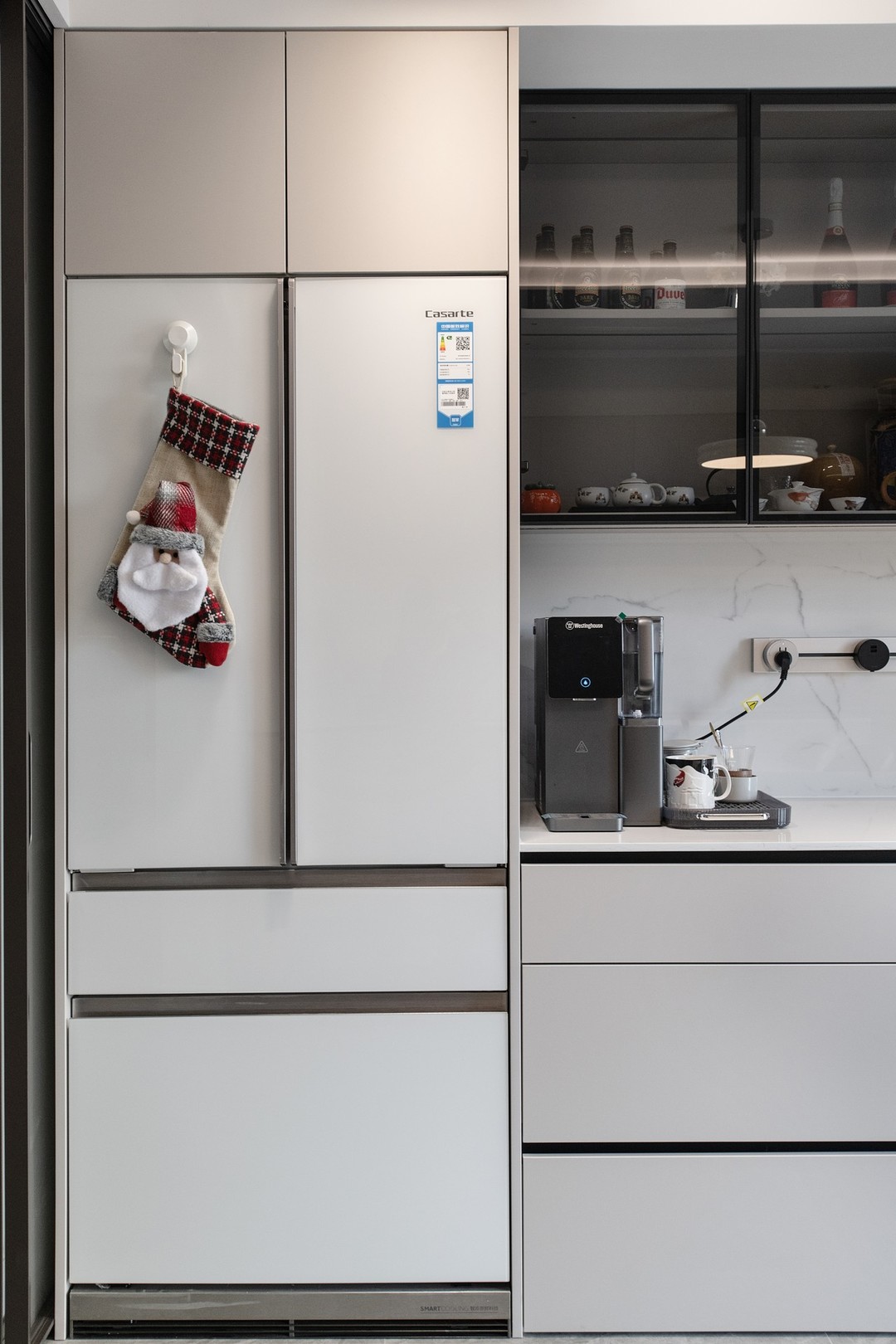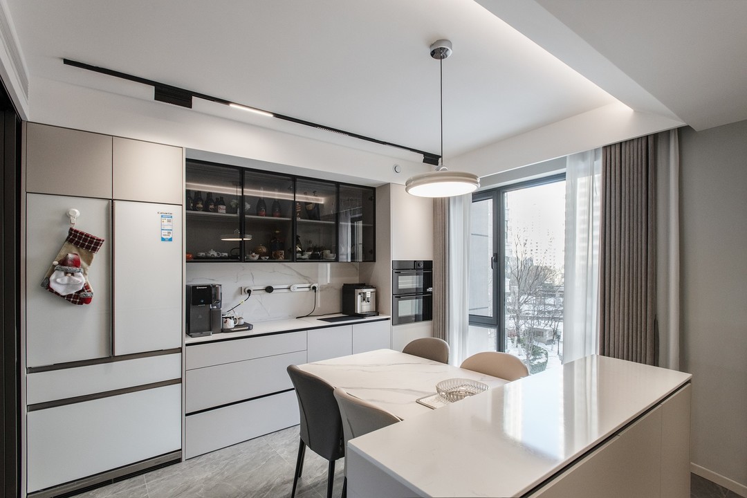 餐厅和厨房由原先分离的状态,合二为一。不仅容纳了橱柜、餐桌,还同时具备了独立岛台和收纳功能极强的餐边柜。餐边柜重要的功能在于整合所有除洗碗机之外的所有嵌入式电器,包括了冰箱,蒸烤箱。以及配餐台面上的各种小电器,这些小电器完全可以解决一些简餐了。