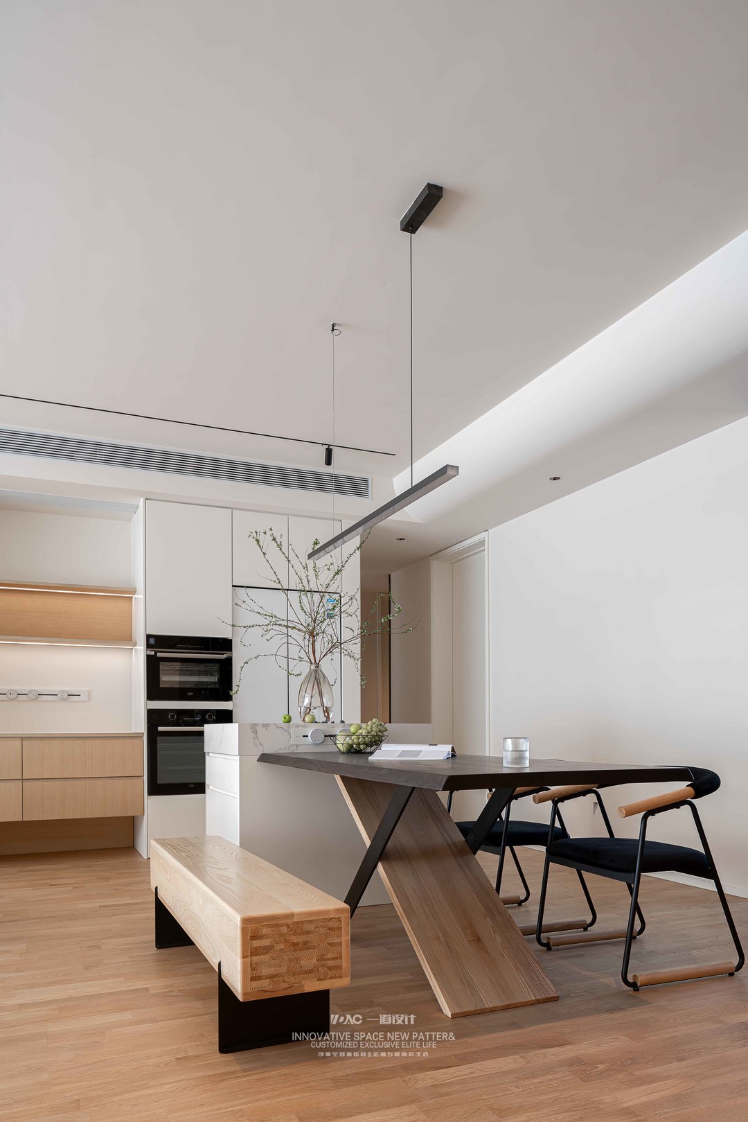 餐厅与客厅扩宽联通,打造了一个开阔而又自然的视觉效果,用餐体验更为舒适,延续整体木质质感的设计,简洁,但是氛围感十足,三色搭配不多不少刚刚好,如果说餐台是一张白纸,绿植和果蔬菜肴就是最好的颜料,装饰这个空间