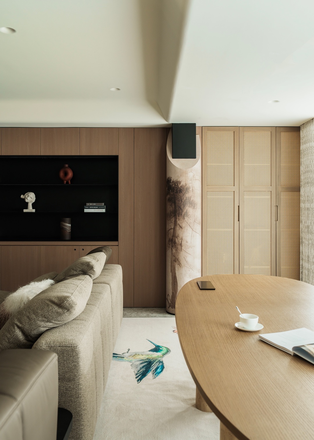 《诗的哲学默想录》中首次将艺术审美与感性认知相联系,并引入“感性思维”的概念。我们在当下的设计发展中也将五感进行联动,构建了另一番流动的视觉景象。本项目因种种原因用时两年完成,近两年的时间设计的审美在不断发生变化,但居所主人的个性会与他们的生活方式相伴,永远充满自我个性;我们认为设计中的情感因素十分重要,我们创造了独属于他们的快乐。