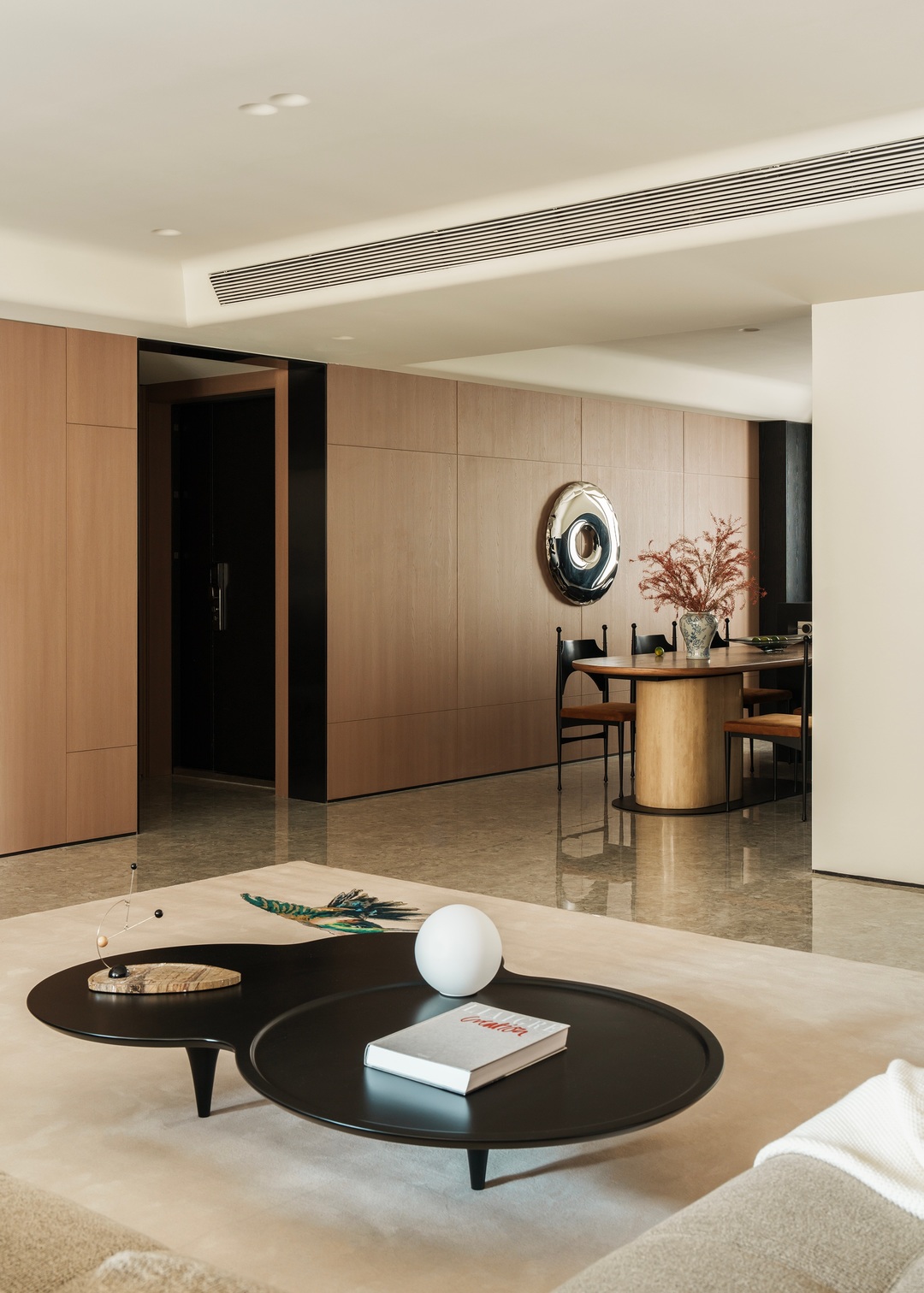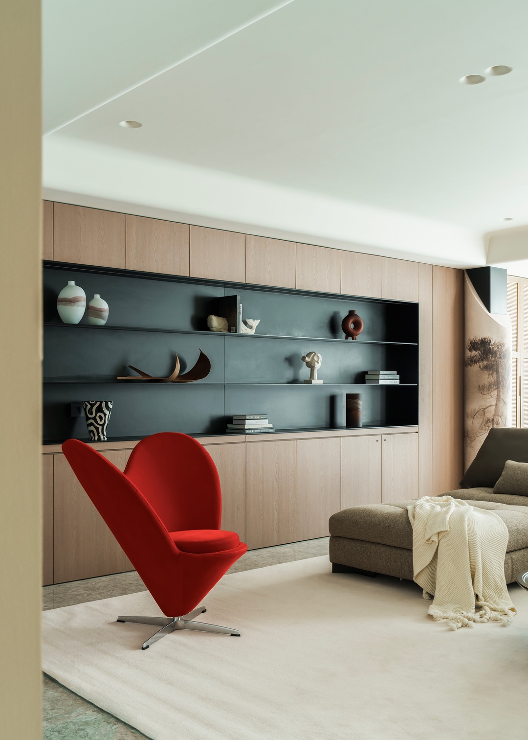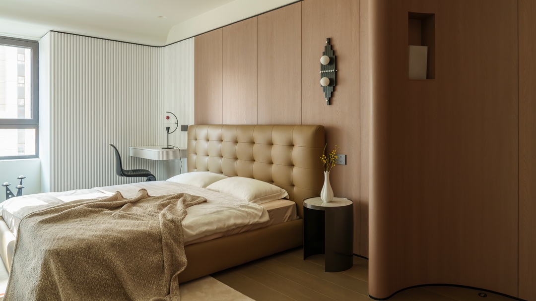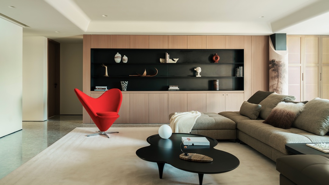 这间项目位于山西大学旁,项目为年轻的五口之家设计,客户的愿望是希望在室内能为三个孩子提供自然,舒适,富有诗书气韵的灵动生活氛围;宽敞的客厅几乎占据了整个空间,住宅营造着优雅而富有艺术感的美学气质,既受东方文化风格的影响,又将其作为局部点缀,贯穿室内。内部主要的饰面为木材,地面保留了原有的地砖,中性色与红色活力交织,为所有的家庭成员打造了一处适合休息和娱乐的场所。