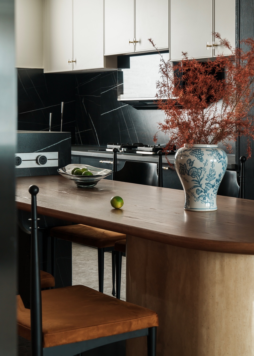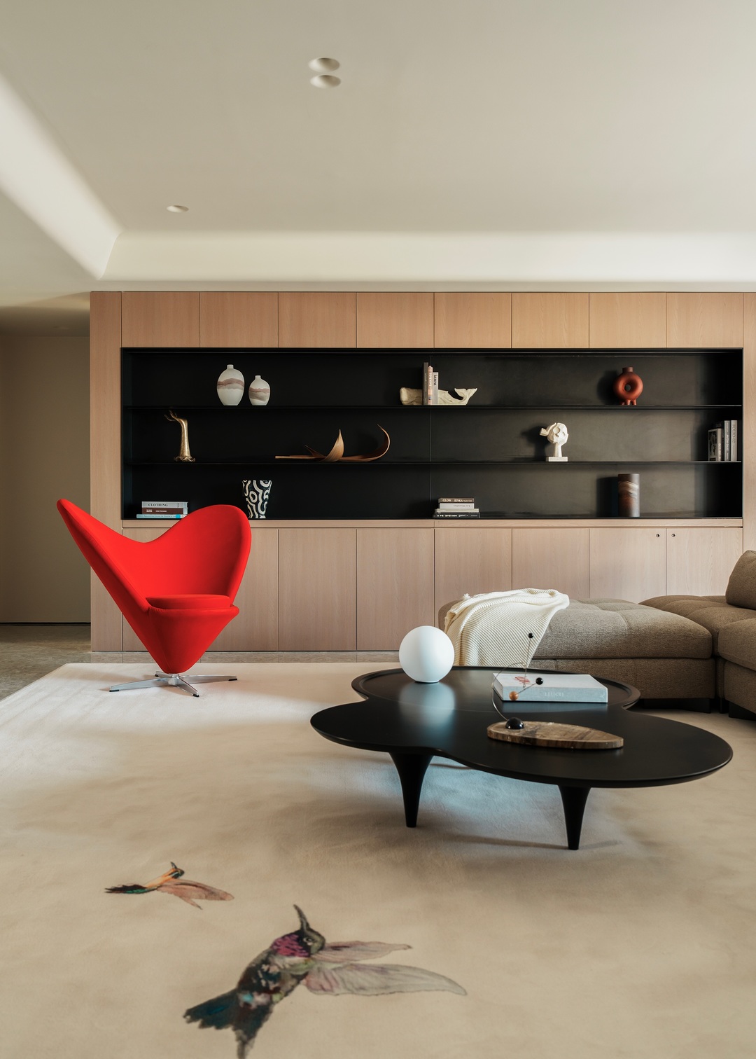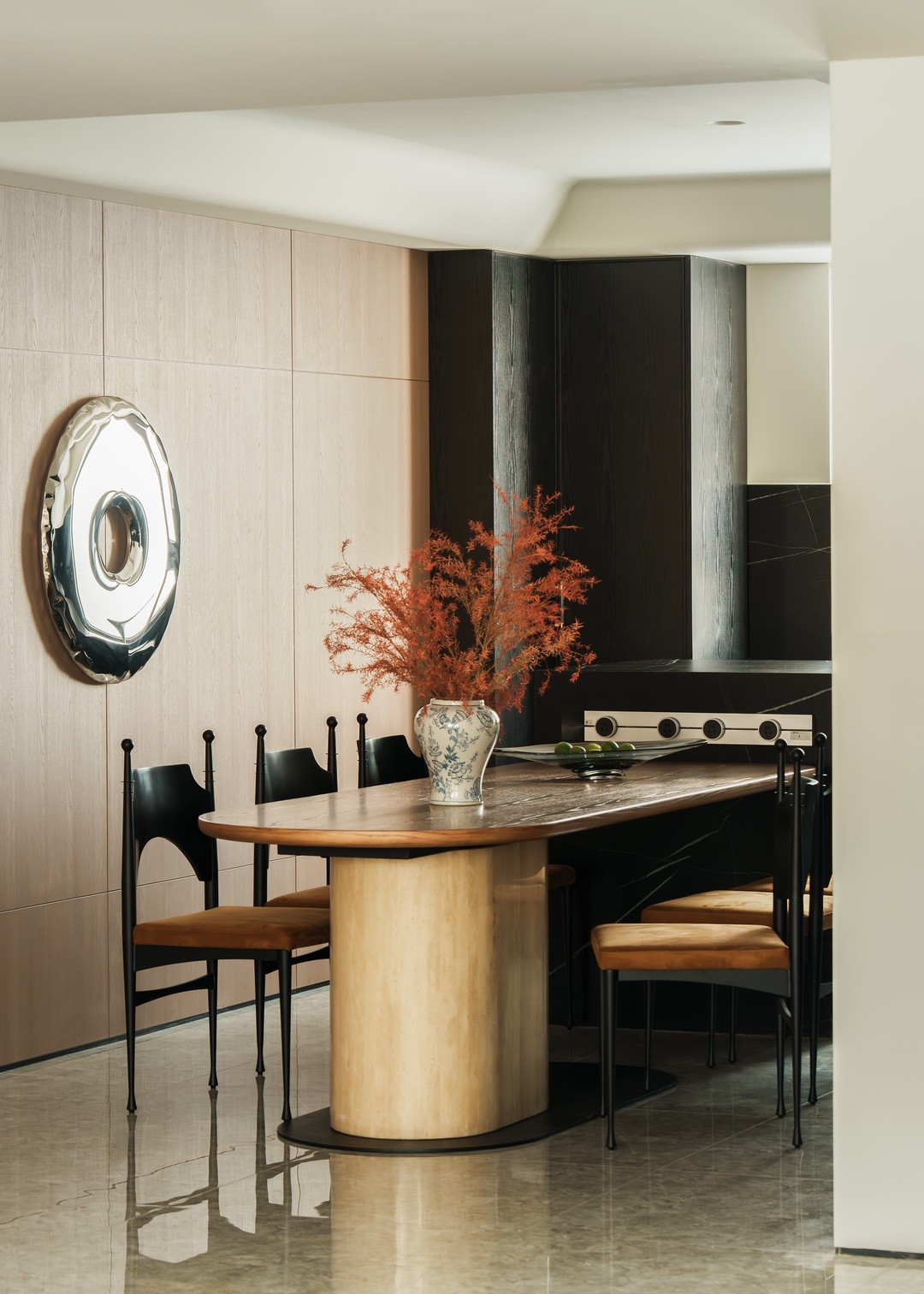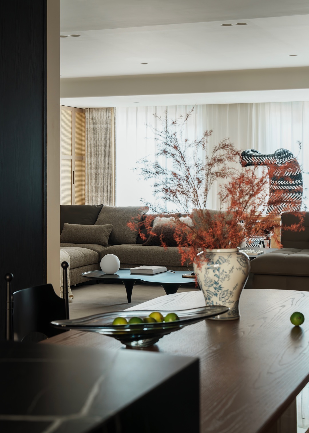 这间项目位于山西大学旁,项目为年轻的五口之家设计,客户的愿望是希望在室内能为三个孩子提供自然,舒适,富有诗书气韵的灵动生活氛围;宽敞的客厅几乎占据了整个空间,住宅营造着优雅而富有艺术感的美学气质,既受东方文化风格的影响,又将其作为局部点缀,贯穿室内。内部主要的饰面为木材,地面保留了原有的地砖,中性色与红色活力交织,为所有的家庭成员打造了一处适合休息和娱乐的场所。