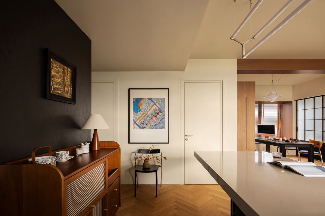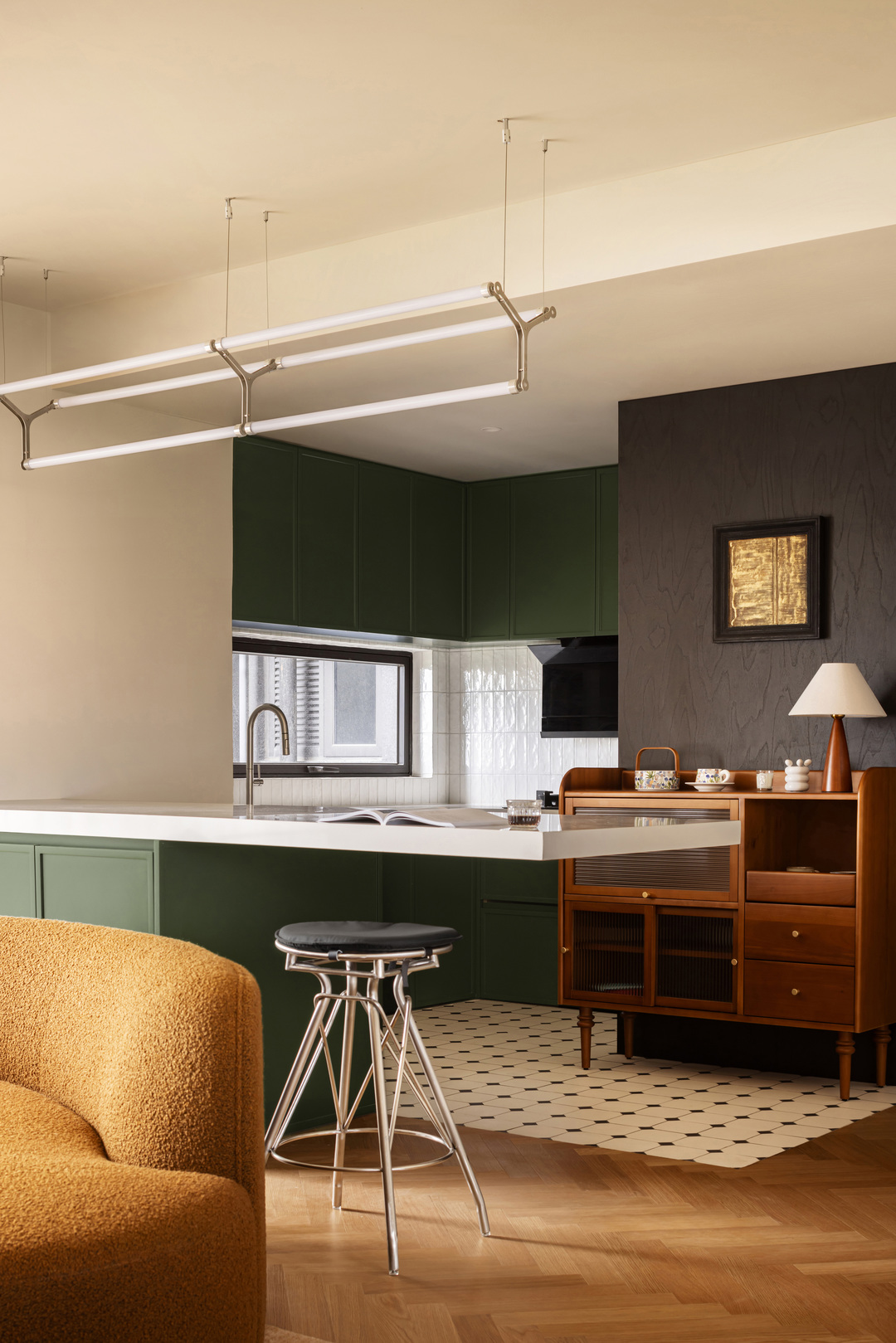 原先操作台面向外进行延伸,划分了厨房,就餐区域到客厅三者的空间。做饭也好,用餐也罢,生活场景灵活切换的同时,彼此间的动线衔接更加流畅