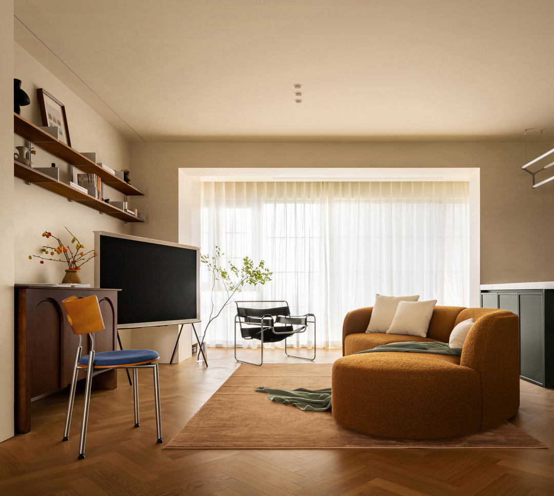 客厅整体受限于承重墙,格局上难有较大变动。因此我们结合屋主的需求,打破客厅常规布置手法、以灵活性家具为主,让空间的松弛感拉满
