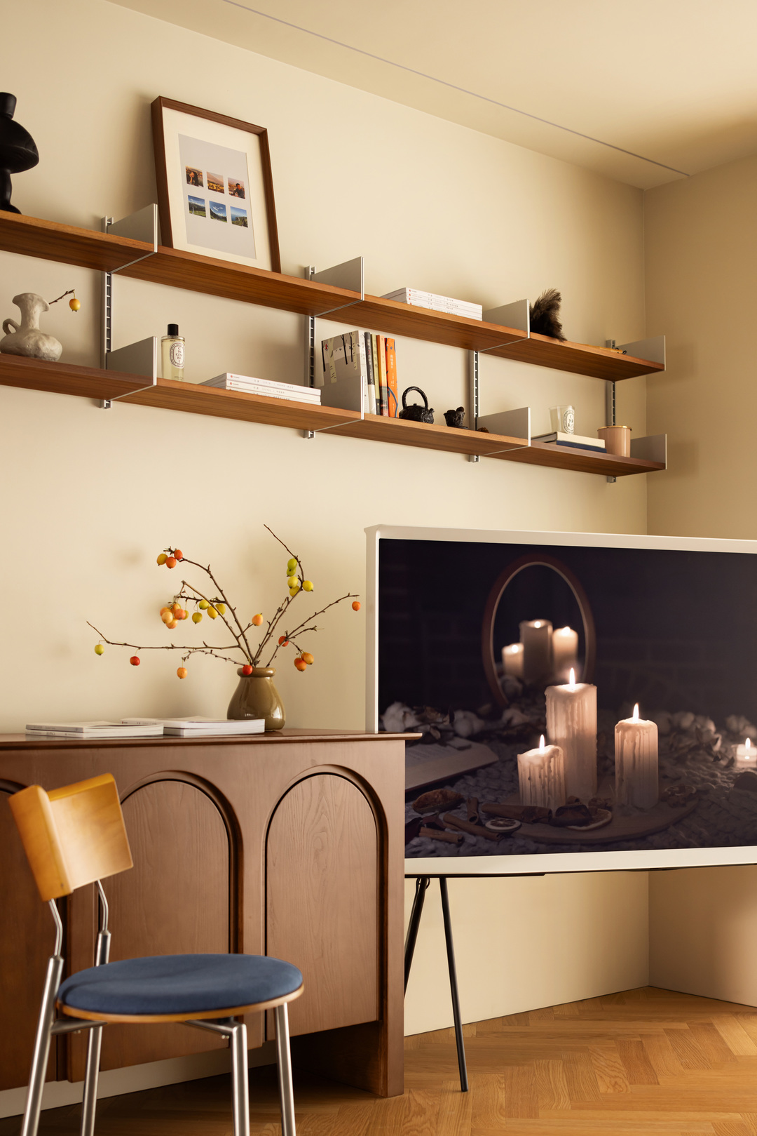 位于电视上方的置物架结合了收纳与展示功能,为空间提供了实用的存储方案。精心点缀了空旷无趣的墙面,带来视觉上的愉悦