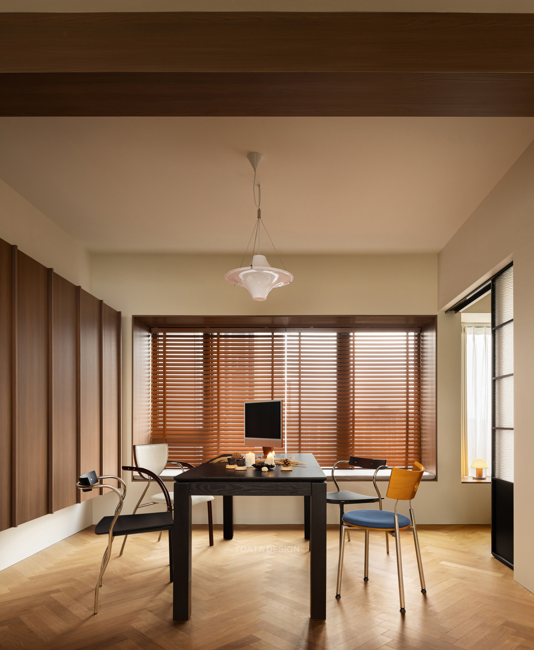 原书房转变为多功能房后,遍布了许多有趣个性的元素。充满木质格调的极简黑色长桌,双人办公也不显局促。悬挂于上方的飞碟吊灯,其光影的美感加持下,营造出舒适、温暖的空间